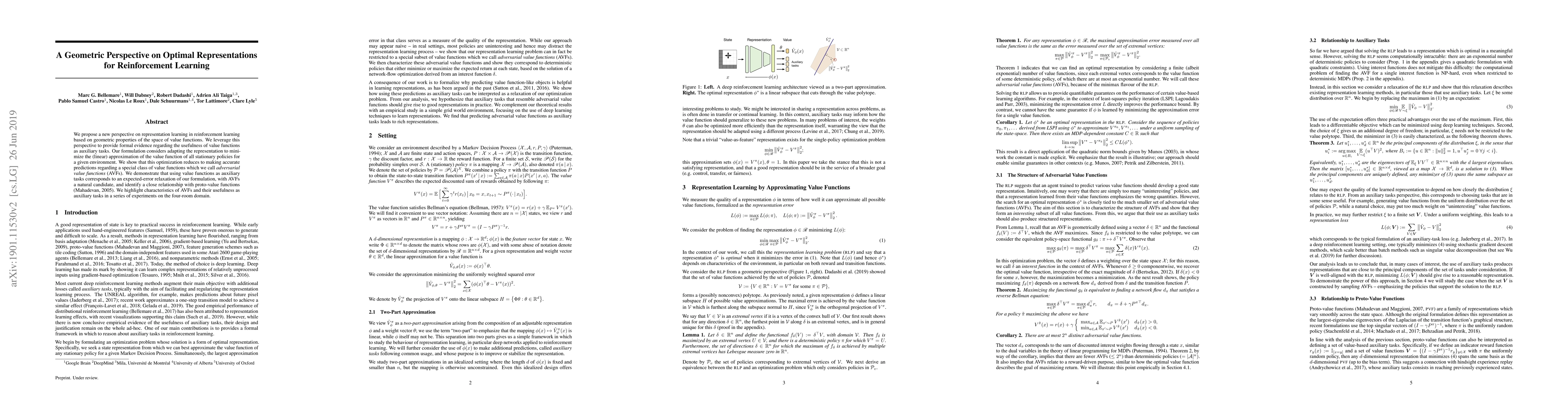 This paper presents a geometric approach to representation learning in reinforcement learning, focusing on minimizing linear approximations of value functions for all stationary policies. It introduces adversarial value functions (AVFs) as a crucial class for accurate predictions and demonstrates their effectiveness as auxiliary tasks through experiments in the four-room domain.