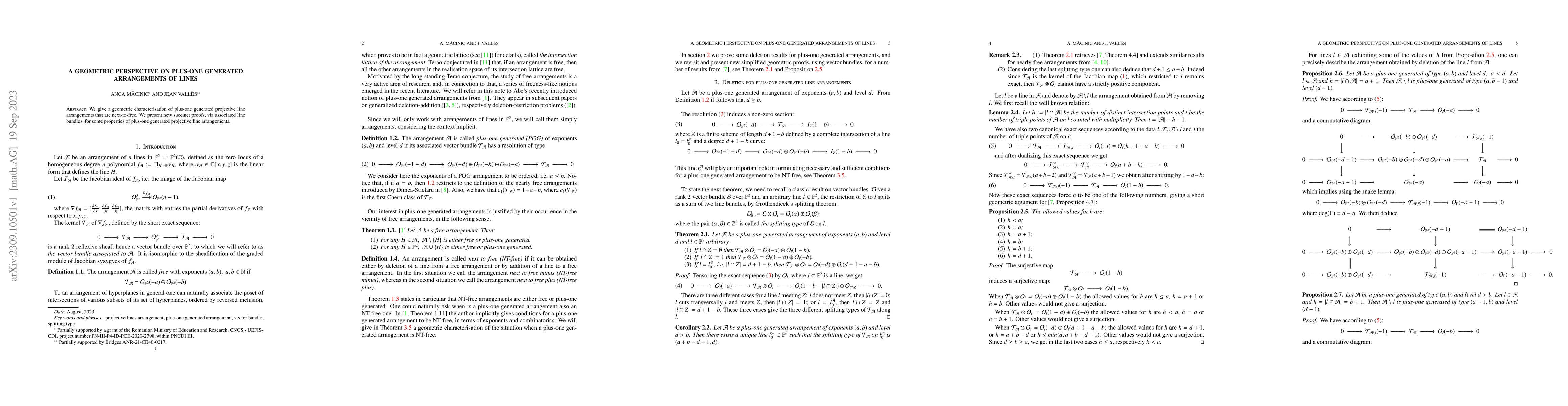 This paper characterizes plus-one generated projective line arrangements that are next-to-free geometrically and provides new proofs for their properties using associated line bundles. The focus is on simplifying and clarifying the geometric aspects of these arrangements.