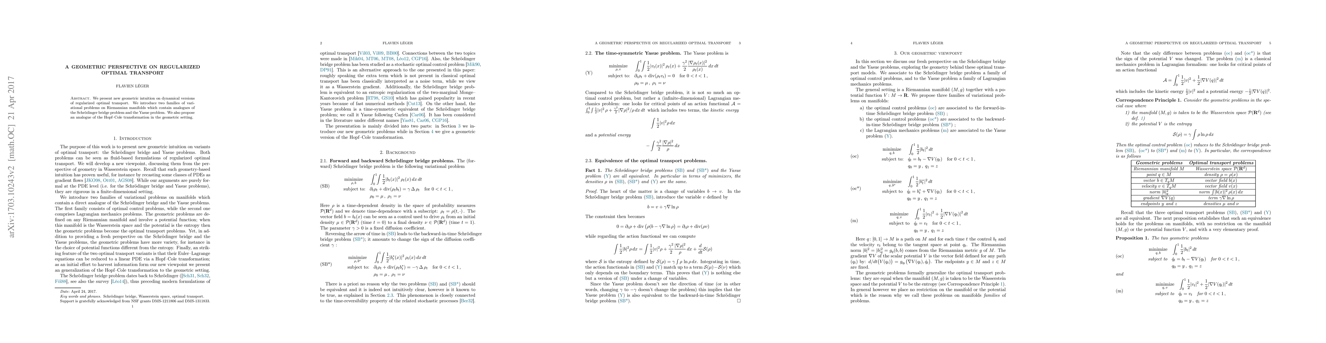 We present new geometric intuition on dynamical versions of regularized optimal transport. We introduce two families of variational problems on Riemannian manifolds which contain analogues of the Schr\"odinger bridge problem and the Yasue problem. We also propose an analogue of the Hopf--Cole transformation in the geometric setting.