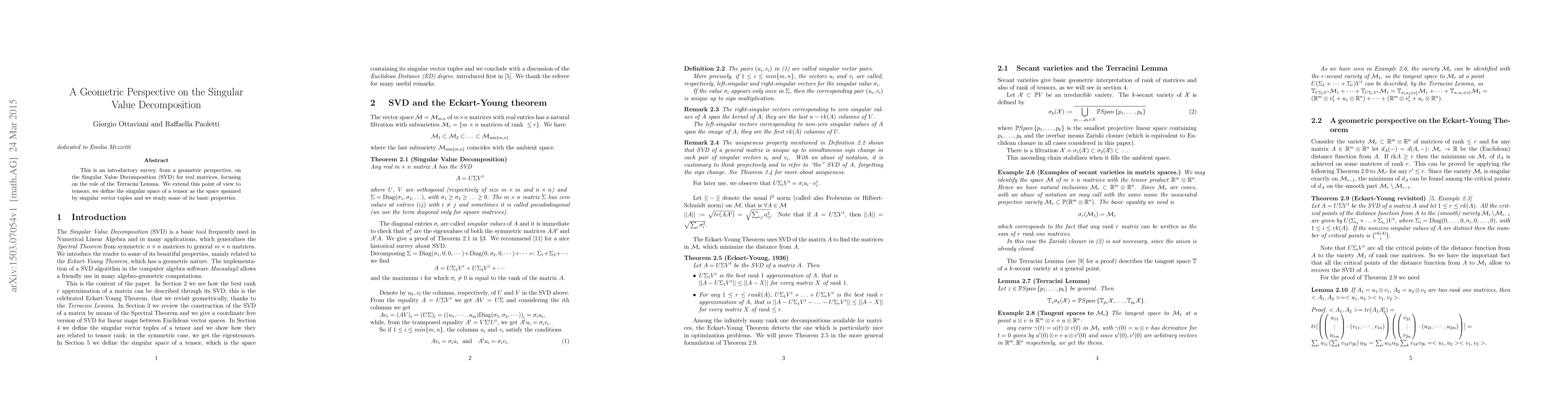 This paper provides a geometric introduction to the Singular Value Decomposition (SVD) for real matrices, emphasizing the Terracini Lemma's role. It extends the geometric perspective to tensors, defining the singular space and exploring its fundamental properties.