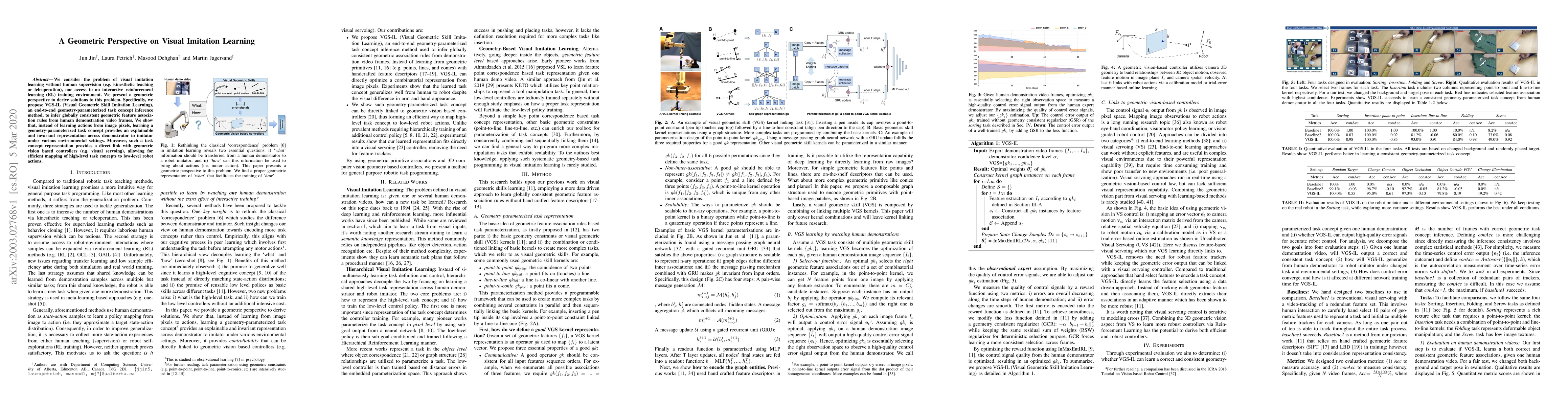 This paper proposes VGS-IL, a method for visual imitation learning without human supervision, by inferring globally consistent geometric feature association rules from demonstration videos. It demonstrates that learning a geometry-parameterized task concept offers an invariant and explainable representation, facilitating efficient mapping to robot actions via geometric vision-based controllers.