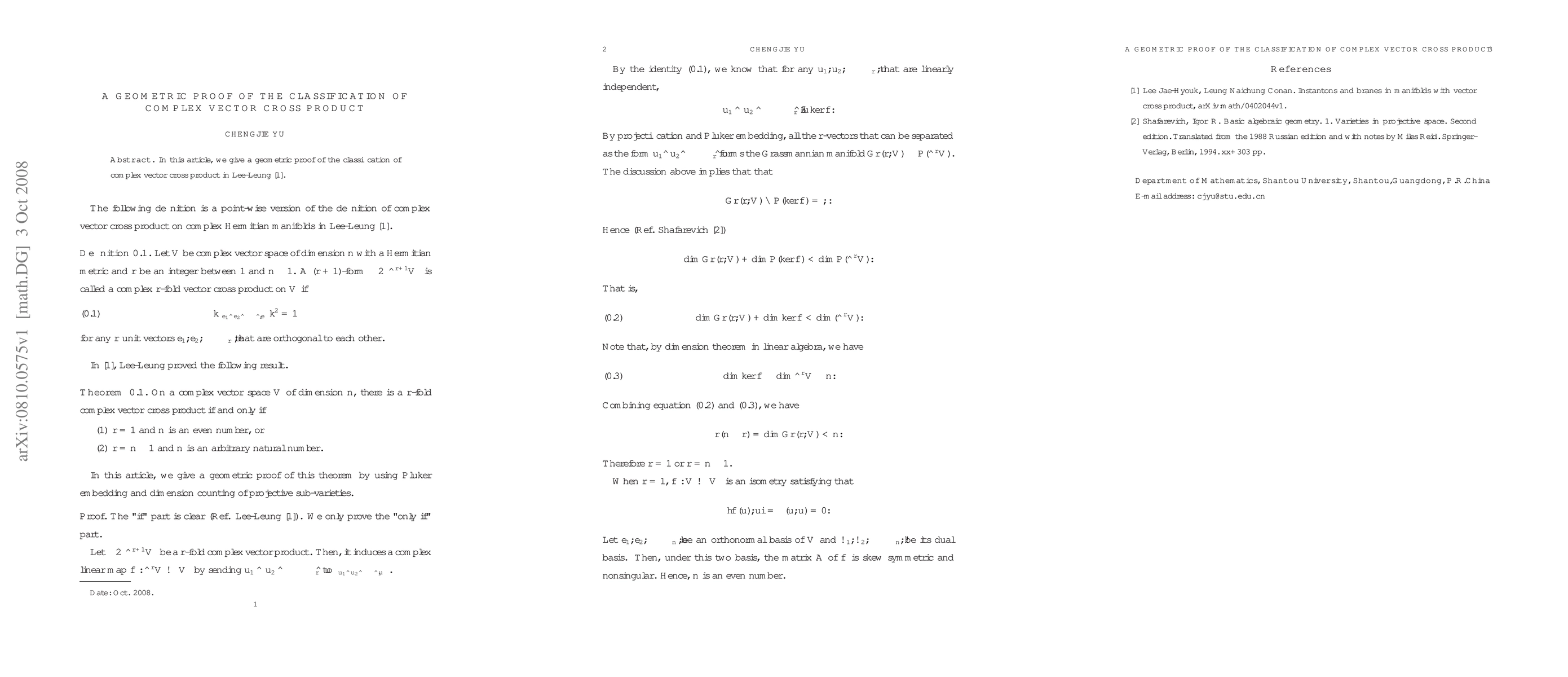 In this article, we give a geometric proof of the classification of complex vector cross product due to Lee-Leung.