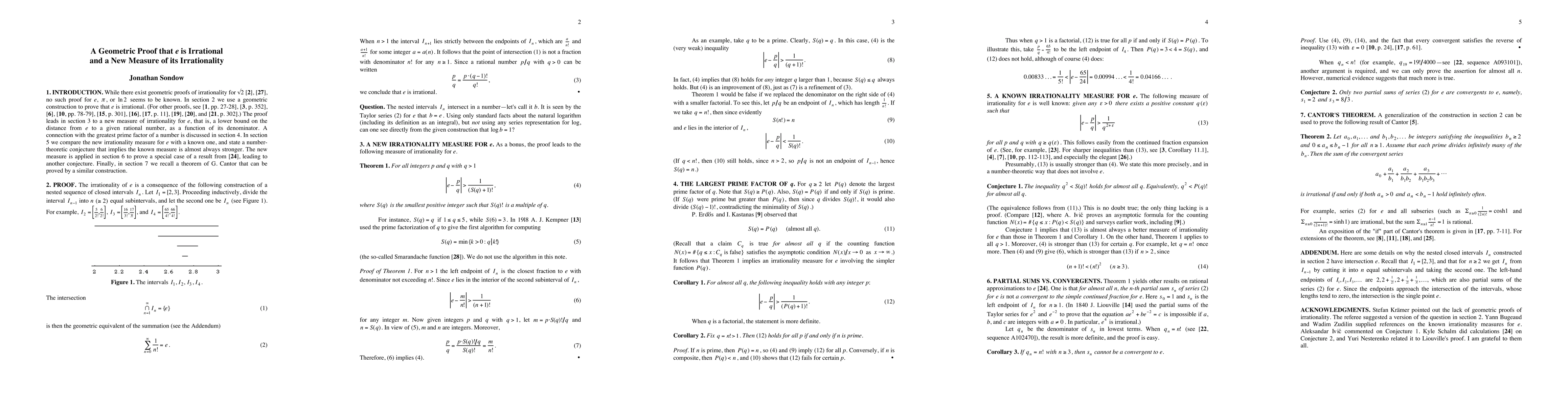 We give a simple geometric proof that $e$ is irrational, using a construction of a nested sequence of closed intervals with intersection $e$. The proof leads to a new measure of irrationality for $e$: if $p$ and $q$ are integers with $q > 1$, then $|e - p/q| > 1/(S(q)+1)!$, where $S(q)$ is the smallest positive integer such that $S(q)!$ is a multiple of $q$. We relate this measure for $e$ to a known one and to the greatest prime factor of an integer. We make two conjectures and recall a theorem of Cantor that can be proved by a similar construction.