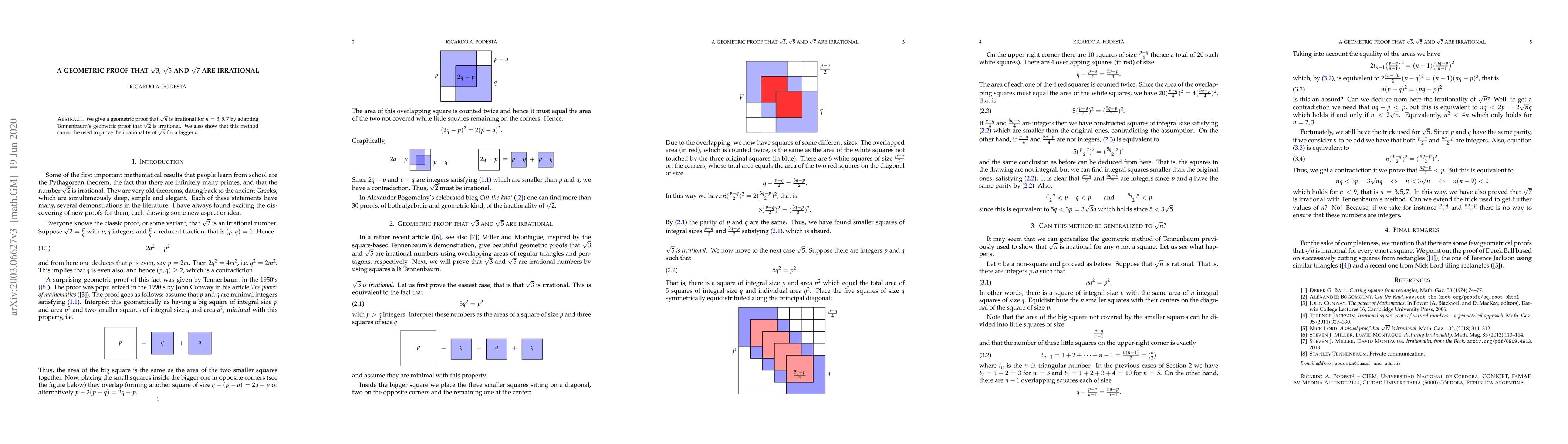 Summary: This paper presents a geometric proof to demonstrate the irrationality of $\sqrt{3}$, $\sqrt{5}$, and $\sqrt{7}$ by extending Tennenbaum's method for proving $\sqrt{2}$ irrational. It concludes that this approach cannot be generalized to prove the irrationality of $\sqrt{n}$ for larger $n$.