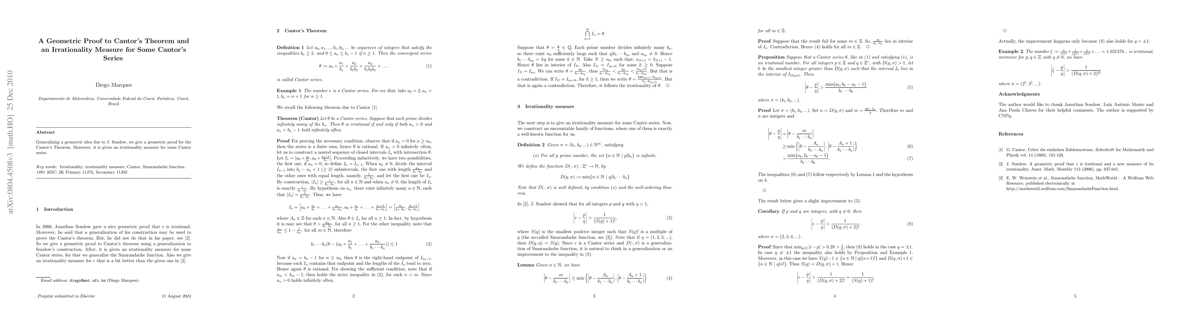 Generalizing a geometric idea due to J. Sondow, we give a geometric proof for the Cantor's Theorem. Moreover, it is given an irrationality measure for some Cantor series.