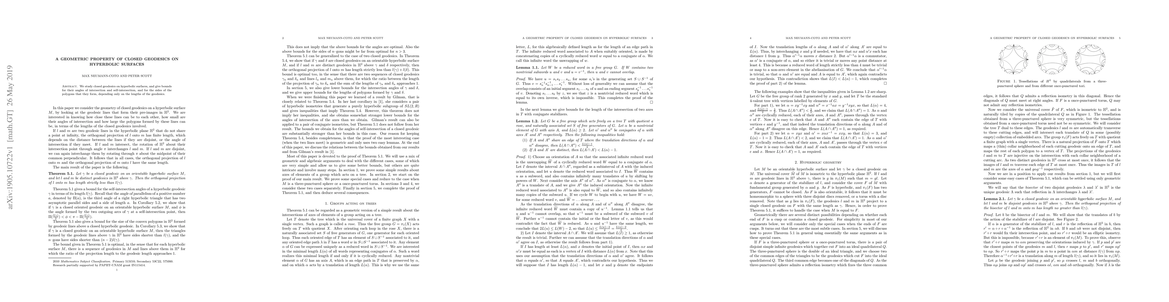 Summary: This paper investigates the geometric properties of closed geodesics on hyperbolic surfaces, establishing bounds for their intersection angles and polygon side lengths based solely on the geodesic lengths. The findings provide insights into the intrinsic geometry of hyperbolic surfaces.