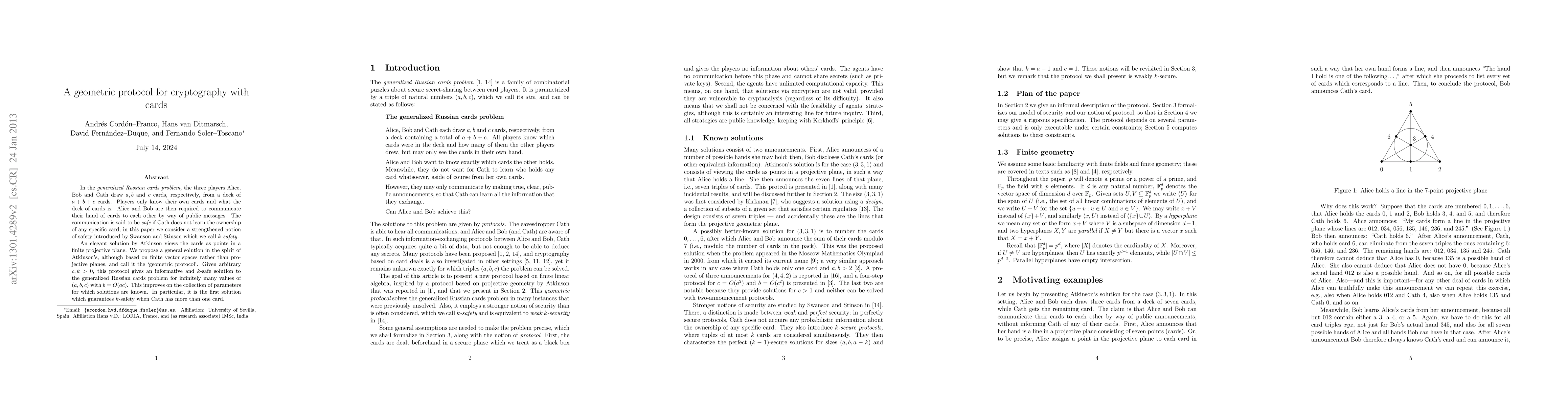 This paper presents a "geometric protocol" for a cryptographic protocol based on the generalized Russian cards problem, improving upon previous solutions by ensuring k-safety even when the third player, Cath, holds multiple cards. The proposed method leverages finite vector spaces, offering a more flexible and informative communication solution.