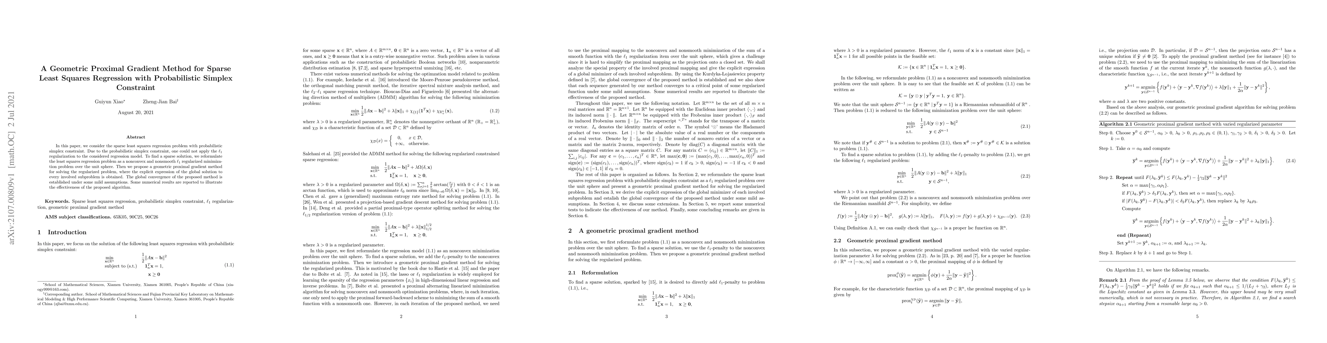 This paper proposes a geometric proximal gradient method to solve sparse least squares regression with a probabilistic simplex constraint, reformulating the problem as a nonconvex L1 regularized minimization over the unit sphere. The method achieves global convergence and demonstrates effectiveness through numerical results.