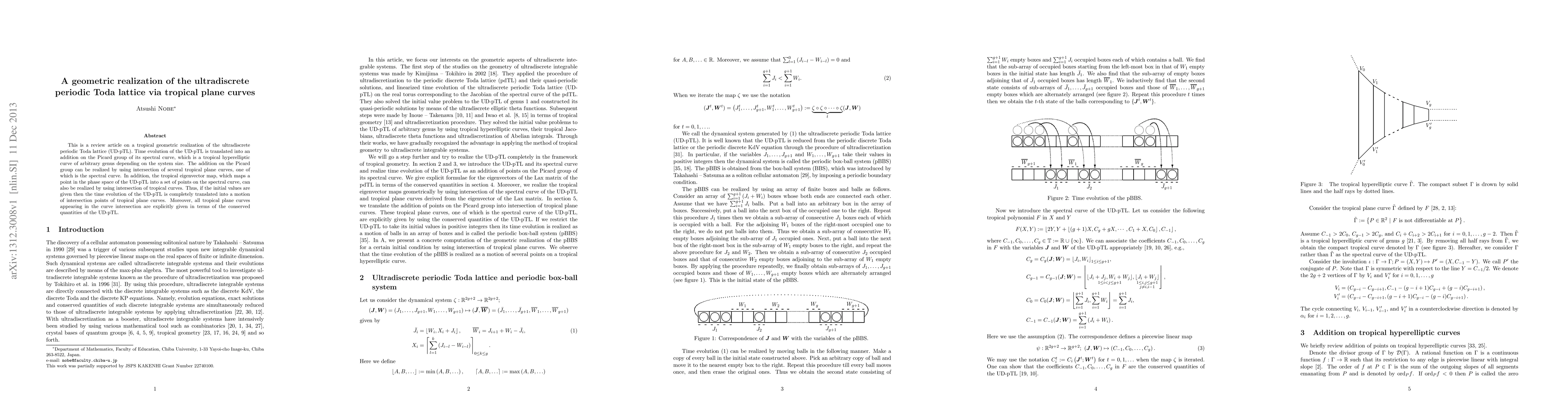 This is a review article on a tropical geometric realization of the ultradiscrete periodic Toda lattice (UD-pTL). Time evolution of the UD-pTL is translated into an addition on the Picard group of its spectral curve, which is a tropical hyperelliptic curve of arbitrary genus depending on the system size. The addition on the Picard group can be realized by using intersection of several tropical plane curves, one of which is the spectral curve. In addition, the tropical eigenvector map, which maps a point in the phase space of the UD-pTL into a set of points on the spectral curve, can also be realized by using intersection of tropical curves. Thus, if the initial values are given then the time evolution of the UD-pTL is completely translated into a motion of intersection points of tropical plane curves. Moreover, all tropical plane curves appearing in the curve intersection are explicitly given in terms of the conserved quantities of the UD-pTL.