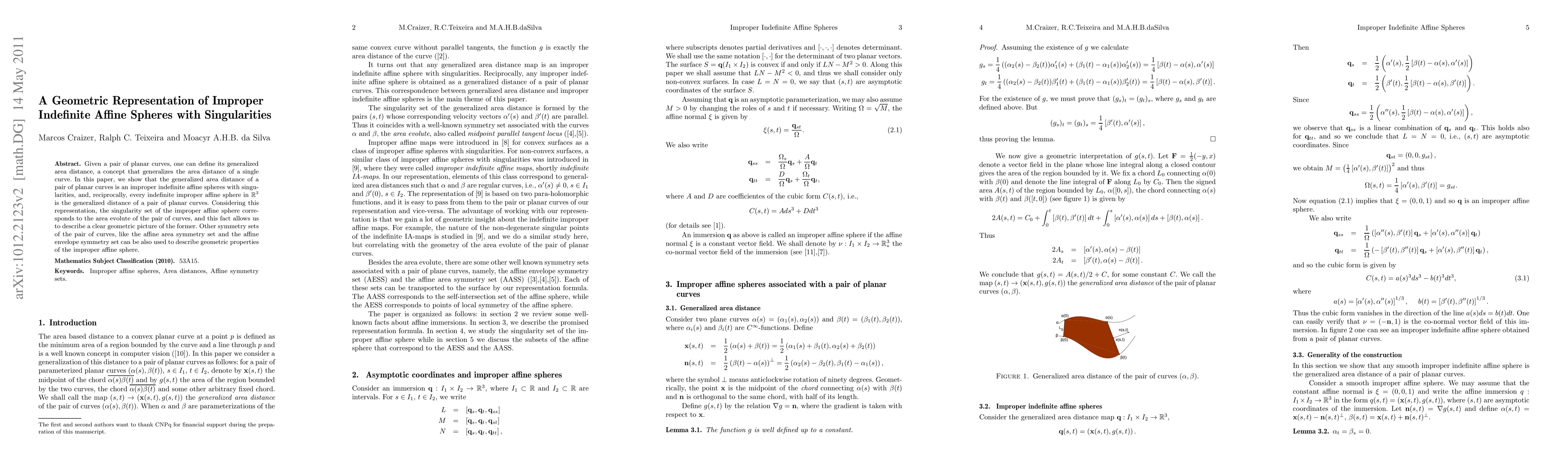 Given a pair of planar curves, one can define its generalized area distance, a concept that generalizes the area distance of a single curve. In this paper, we show that the generalized area distance of a pair of planar curves is an improper indefinite affine spheres with singularities, and, reciprocally, every indefinite improper affine sphere in $\R^3$ is the generalized distance of a pair of planar curves. Considering this representation, the singularity set of the improper affine sphere corresponds to the area evolute of the pair of curves, and this fact allows us to describe a clear geometric picture of the former. Other symmetry sets of the pair of curves, like the affine area symmetry set and the affine envelope symmetry set can be also used to describe geometric properties of the improper affine sphere.