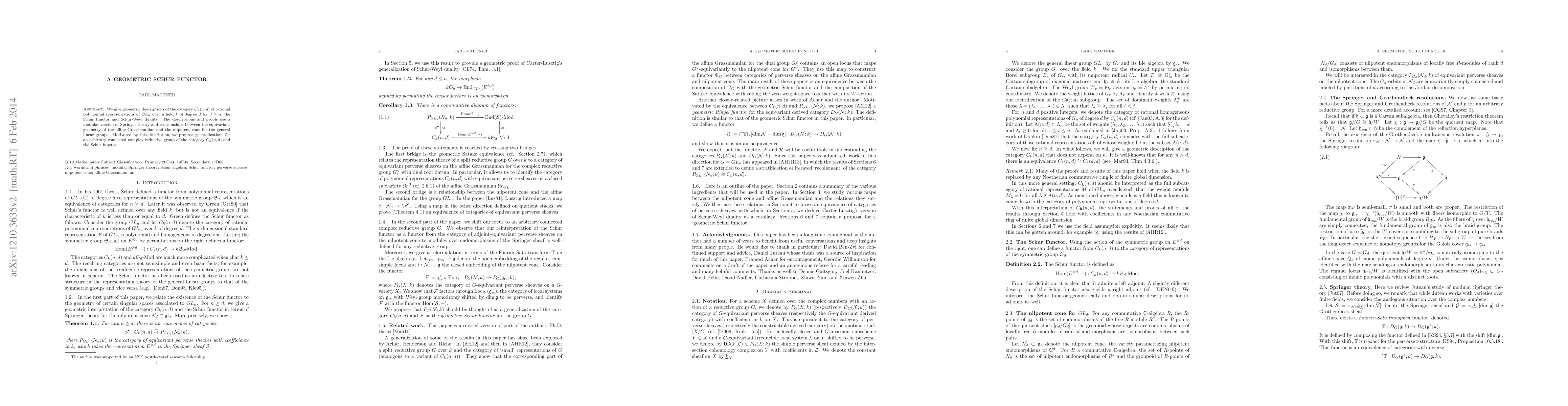 We give geometric descriptions of the category C_k(n,d) of rational polynomial representations of GL_n over a field k of degree d for d less than or equal to n, the Schur functor and Schur-Weyl duality. The descriptions and proofs use a modular version of Springer theory and relationships between the equivariant geometry of the affine Grassmannian and the nilpotent cone for the general linear groups. Motivated by this description, we propose generalizations for an arbitrary connected complex reductive group of the category C_k(n,d) and the Schur functor.