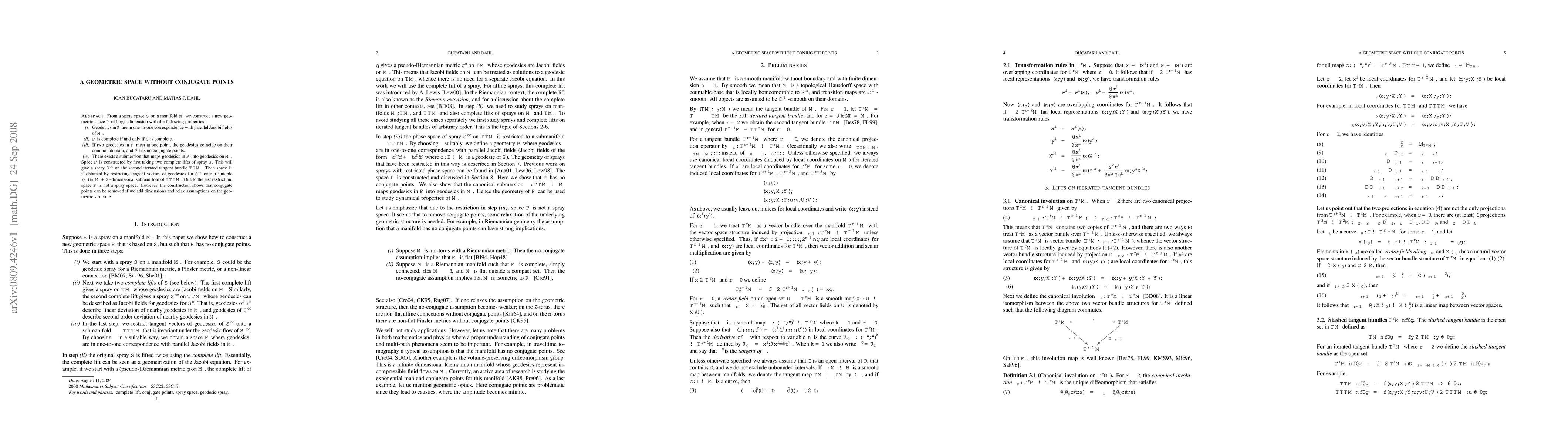 From a spray space $S$ on a manifold $M$ we construct a new geometric space $P$ of larger dimension with the following properties: 1. Geodesics in $P$ are in one-to-one correspondence with parallel Jacobi fields of $M$. 2. $P$ is complete if and only if $S$ is complete. 3. If two geodesics in $P$ meet at one point, the geodesics coincide on their common domain, and $P$ has no conjugate points. 4. There exists a submersion $\pi\colon P \to M$ that maps geodesics in $P$ into geodesics on $M$. Space $P$ is constructed by first taking two complete lifts of spray $S$. This will give a spray $S^{cc}$ on the second iterated tangent bundle $TTM$. Then space $P$ is obtained by restricting tangent vectors of geodesics for $S^{cc}$ onto a suitable $(2\dim M+2)$-dimensional submanifold of $TTTM$. Due to the last restriction, space $P$ is not a spray space. However, the construction shows that conjugate points can be removed if we add dimensions and relax assumptions on the geometric structure.
