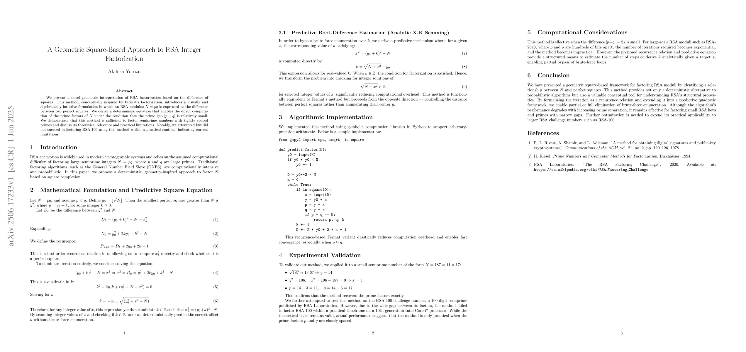 The paper presents a recurrence relation and predictive quadratic framework for RSA factorization, reducing computational overhead and enabling fast convergence when prime factors are closely spaced.