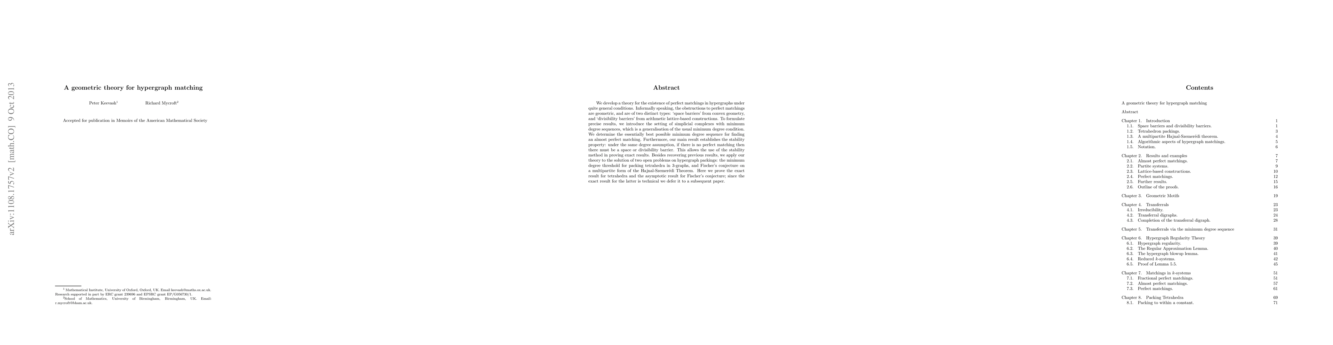 This paper develops a geometric theory for perfect matchings in hypergraphs, identifying geometric obstructions like space barriers and divisibility barriers. It establishes a stability property and applies the theory to solve open problems on hypergraph packing and Fischer's conjecture.