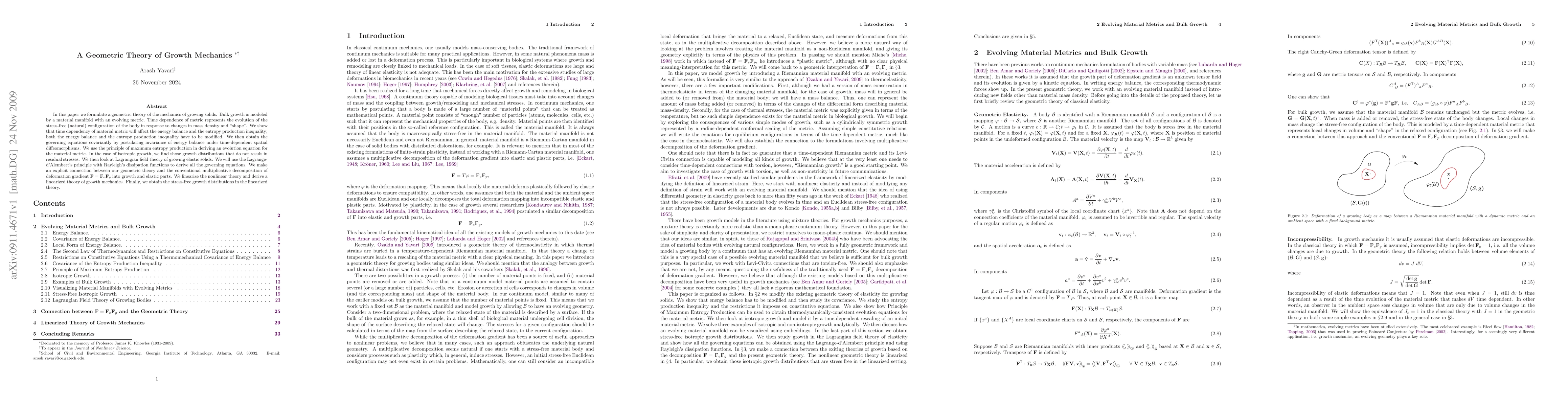 In this paper we formulate a geometric theory of the mechanics of growing solids. Bulk growth is modeled by a material manifold with an evolving metric. Time dependence of metric represents the evolution of the stress-free (natural) configuration of the body in response to changes in mass density and "shape". We show that time dependency of material metric will affect the energy balance and the entropy production inequality; both the energy balance and the entropy production inequality have to be modified. We then obtain the governing equations covariantly by postulating invariance of energy balance under time-dependent spatial diffeomorphisms. We use the principle of maximum entropy production in deriving an evolution equation for the material metric. In the case of isotropic growth, we find those growth distributions that do not result in residual stresses. We then look at Lagrangian field theory of growing elastic solids. We will use the Lagrange-d'Alembert's principle with Rayleigh's dissipation functions to derive all the governing equations. We make an explicit connection between our geometric theory and the conventional multiplicative decomposition of deformation gradient $\mathbf{F}=\mathbf{F}_e\mathbf{F}_g$ into growth and elastic parts. We linearize the nonlinear theory and derive a linearized theory of growth mechanics. Finally, we obtain the stress-free growth distributions in the linearized theory.