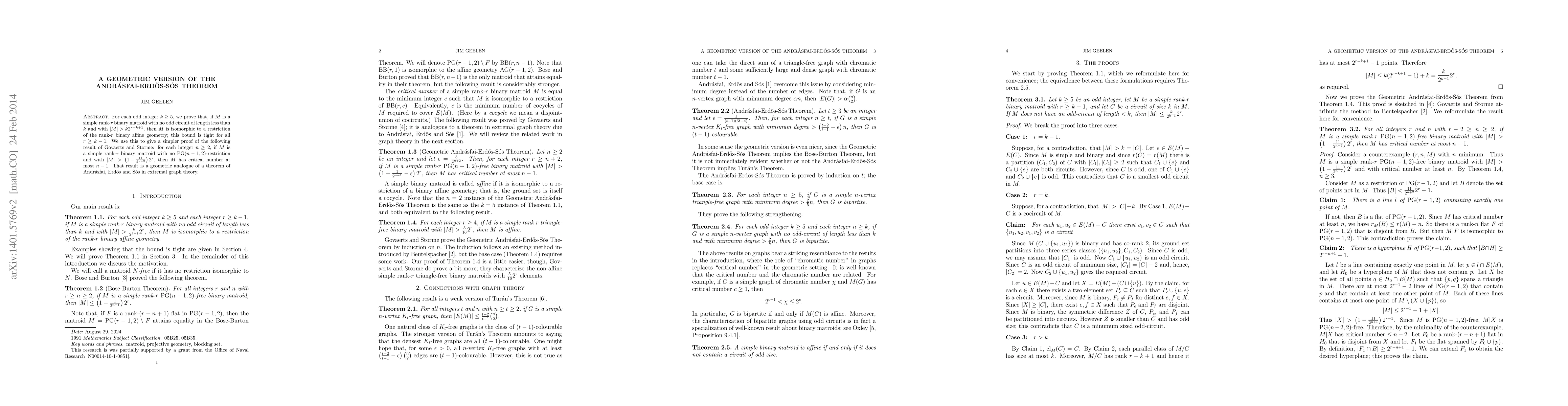 For each odd integer $k\ge 5$, we prove that, if $M$ is a simple rank-$r$ binary matroid with no odd circuit of length less than $k$ and with $|M| > k 2^{r-k+1}$, then $M$ is isomorphic to a restriction of the rank-$r$ binary affine geometry; this bound is tight for all $r\ge k-1$. We use this to give a simpler proof of the following result of Govaerts and Storme: for each integer $n\ge 2$, if $M$ is a simple rank-$r$ binary matroid with no $PG(n-1,2)$-restriction and with $|M| > \left(1-\frac{11}{2^{n+2}}\right) 2^r$, then $M$ has critical number at most $n-1$. That result is a geometric analogue of a theorem of Andrasfai, Erdos, and Sos in extremal graph theory.