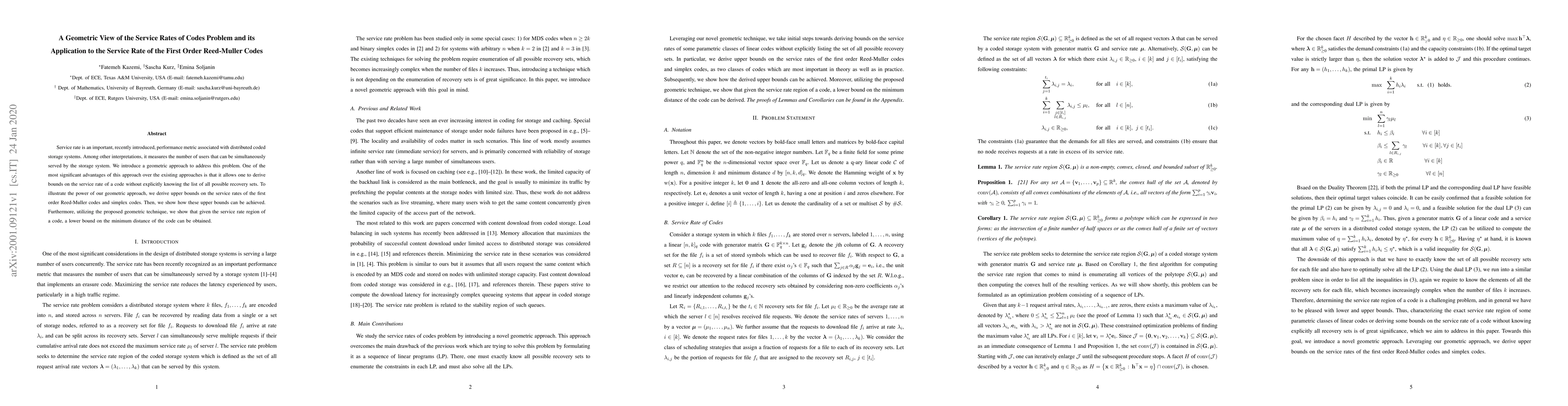 This paper introduces a geometric method to determine the service rates of codes in distributed storage systems, offering bounds without needing all recovery sets. It applies this approach to derive and achieve upper bounds for first order Reed-Muller codes and simplex codes, and demonstrates how this technique can also yield lower bounds on the minimum distance of a code.