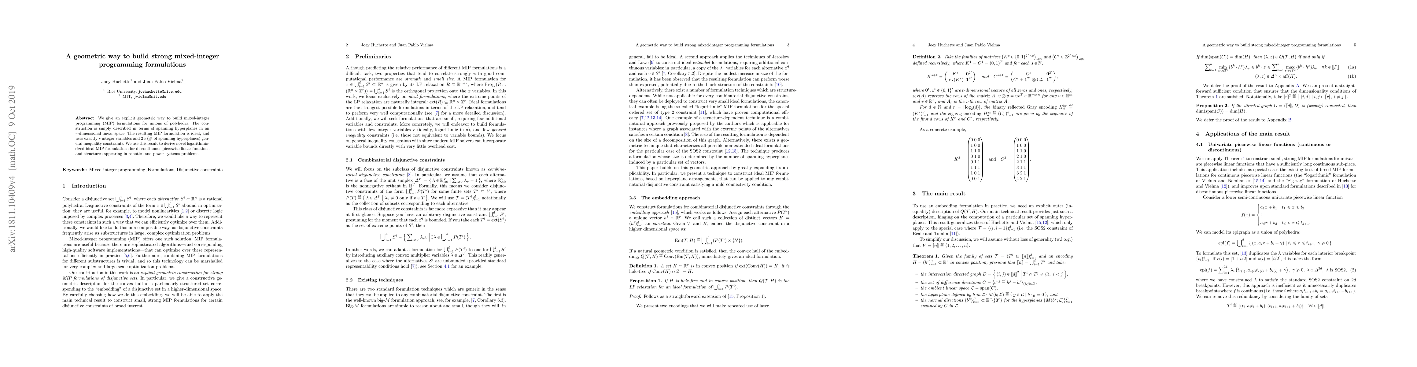 We give an explicit geometric way to build mixed-integer programming (MIP) formulations for unions of polyhedra. The construction is simply described in terms of spanning hyperplanes in an r-dimensional linear space. The resulting MIP formulation is ideal, and uses exactly r integer variables and 2 x (# of spanning hyperplanes) general inequality constraints. We use this result to derive novel logarithmic-sized ideal MIP formulations for discontinuous piecewise linear functions and structures appearing in robotics and power systems problems.