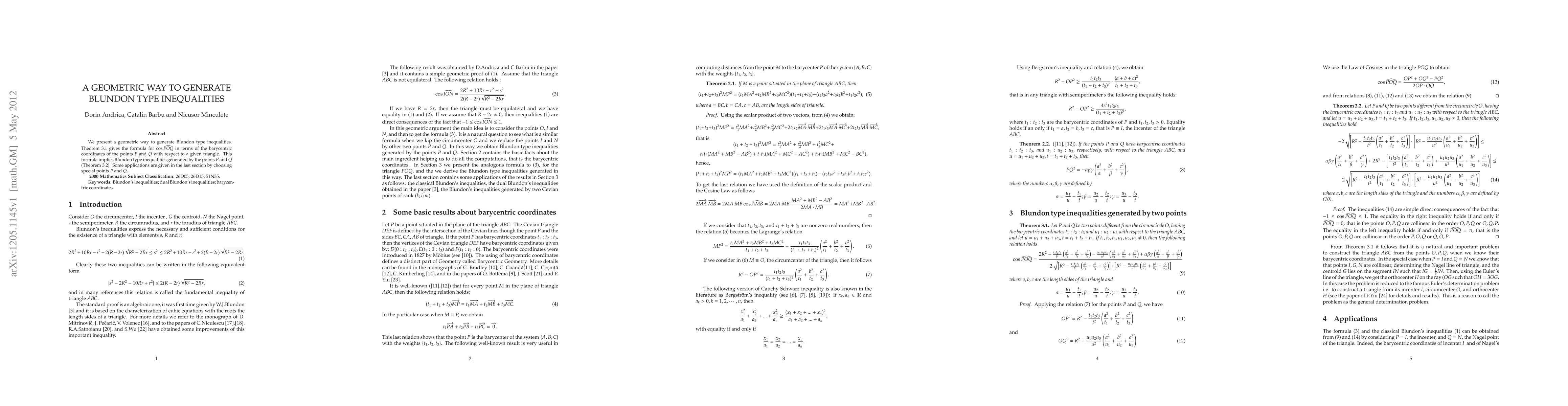 We present a geometric way to generate Blundon type inequalities. Theorem 3.1 gives the formula for cosPOQ in terms of the barycentric coordinates of the points P and Q with respect to a given triangle. This formula implies Blundon type inequalities generated by the points P and Q (Theorem 3.2). Some applications are given in the last section by choosing special points P and Q.