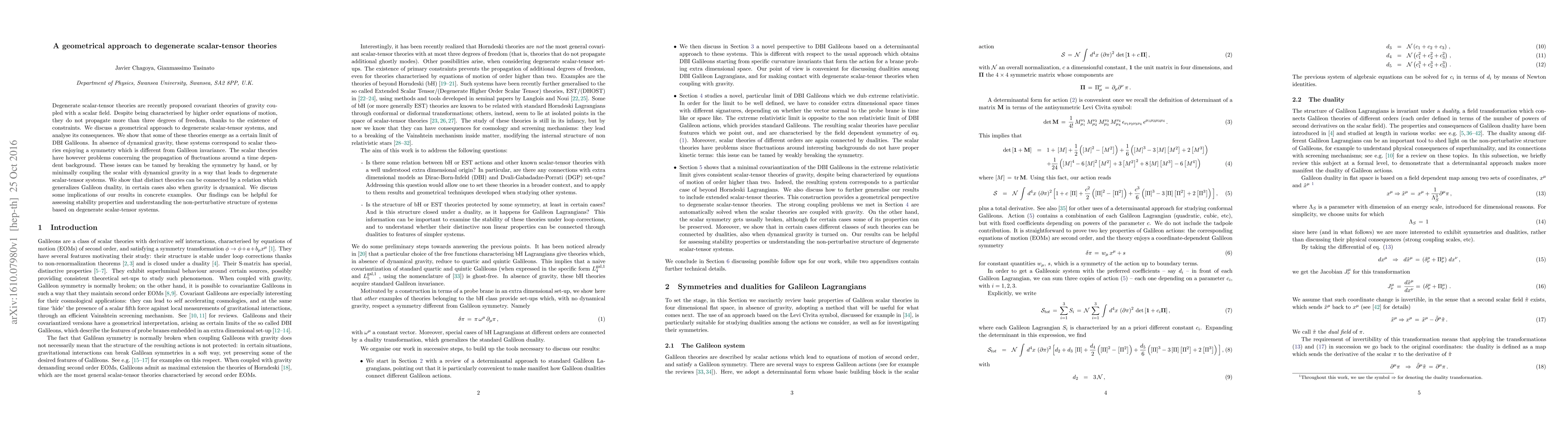 This paper explores a geometrical approach to degenerate scalar-tensor theories, demonstrating that these theories emerge from a limit of DBI Galileons and can be connected through a generalized Galileon duality. The authors highlight issues with scalar propagation in time-dependent backgrounds and propose solutions through symmetry breaking or dynamical gravity coupling.