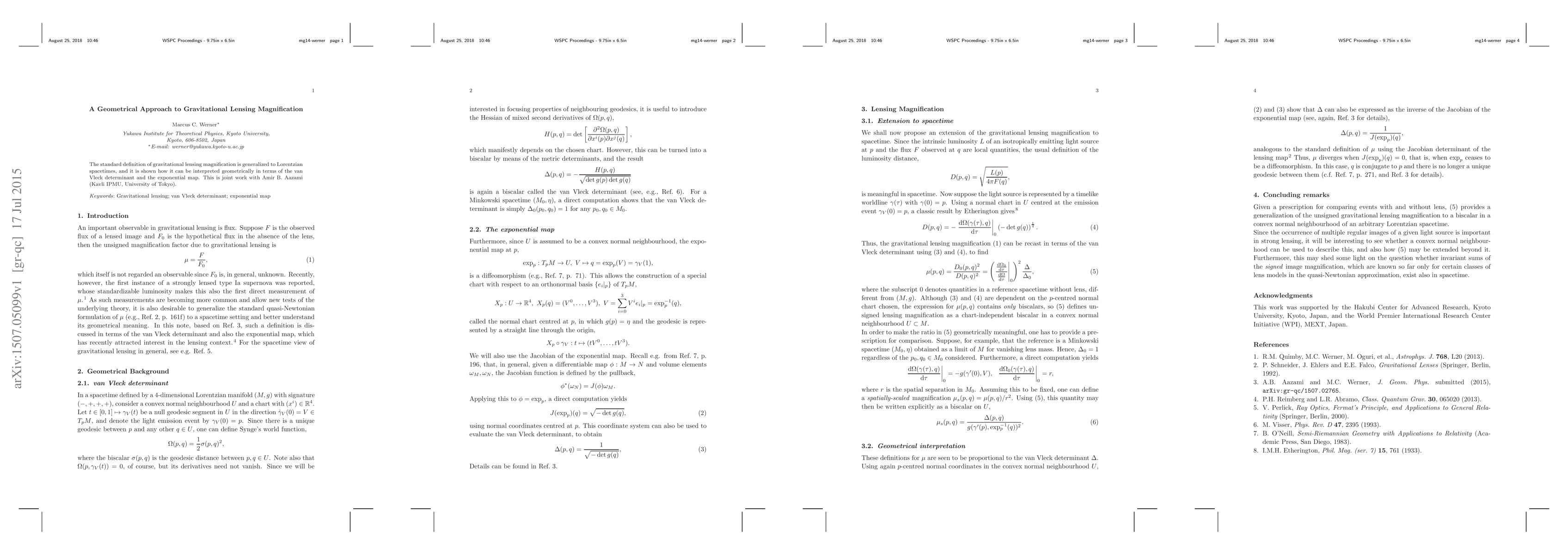 This paper generalizes gravitational lensing magnification to Lorentzian spacetimes, interpreting it geometrically via the van Vleck determinant and the exponential map, a collaborative effort with Amir B. Aazami.