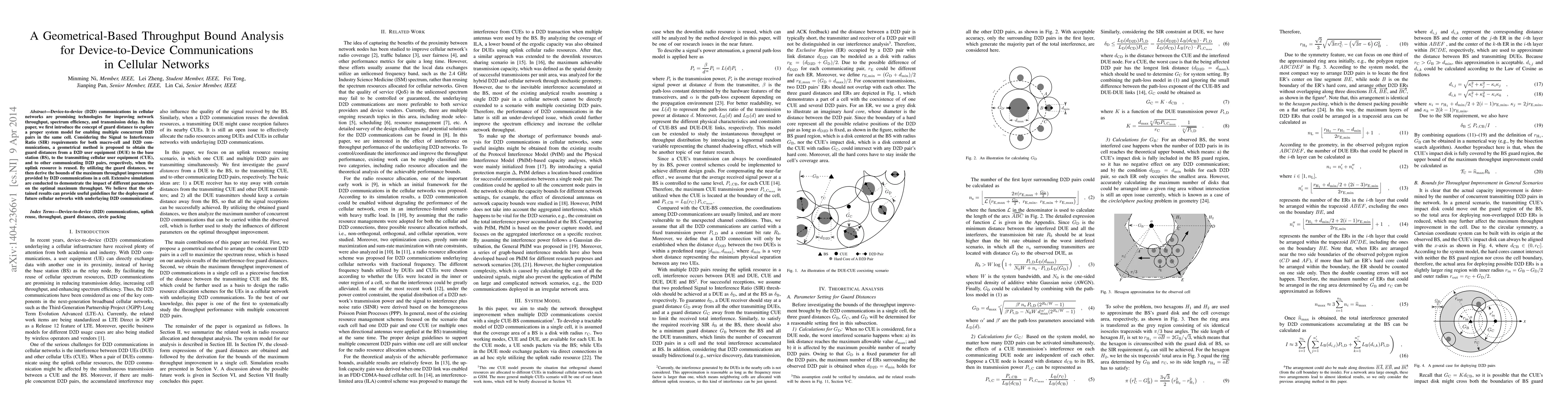 Device-to-device (D2D) communications in cellular networks are promising technologies for improving network throughput, spectrum efficiency, and transmission delay. In this paper, we first introduce the concept of guard distance to explore a proper system model for enabling multiple concurrent D2D pairs in the same cell. Considering the Signal to Interference Ratio (SIR) requirements for both macro-cell and D2D communications, a geometrical method is proposed to obtain the guard distances from a D2D user equipment (DUE) to the base station (BS), to the transmitting cellular user equipment (CUE), and to other communicating D2D pairs, respectively, when the uplink resource is reused. By utilizing the guard distances, we then derive the bounds of the maximum throughput improvement provided by D2D communications in a cell. Extensive simulations are conducted to demonstrate the impact of different parameters on the optimal maximum throughput. We believe that the obtained results can provide useful guidelines for the deployment of future cellular networks with underlaying D2D communications.
