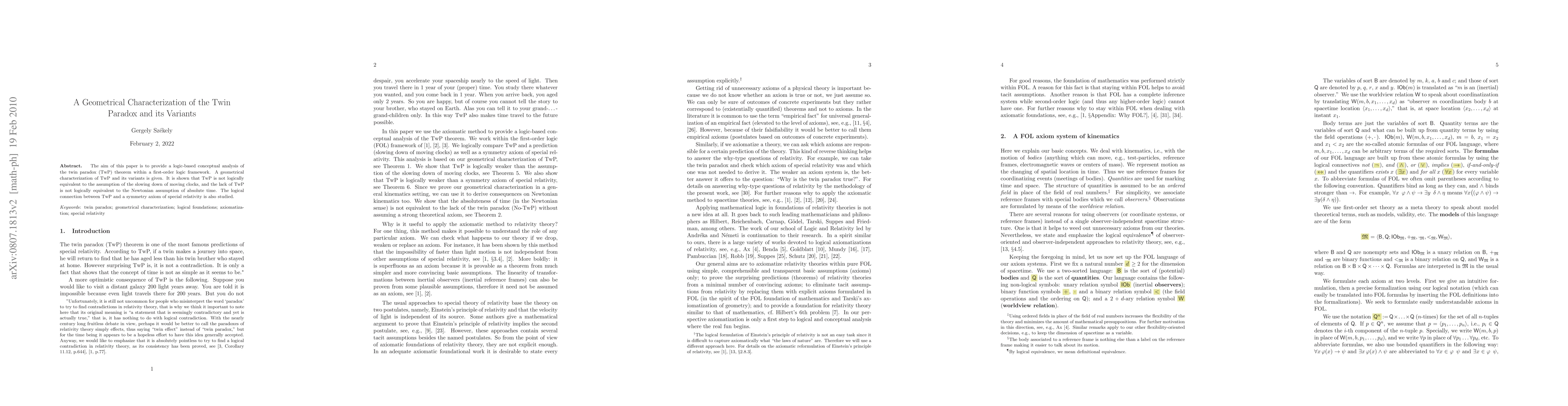 The aim of this paper is to provide a logic-based conceptual analysis of the twin paradox (TwP) theorem within a first-order logic framework. A geometrical characterization of TwP and its variants is given. It is shown that TwP is not logically equivalent to the assumption of the slowing down of moving clocks, and the lack of TwP is not logically equivalent to the Newtonian assumption of absolute time. The logical connection between TwP and a symmetry axiom of special relativity is also studied.