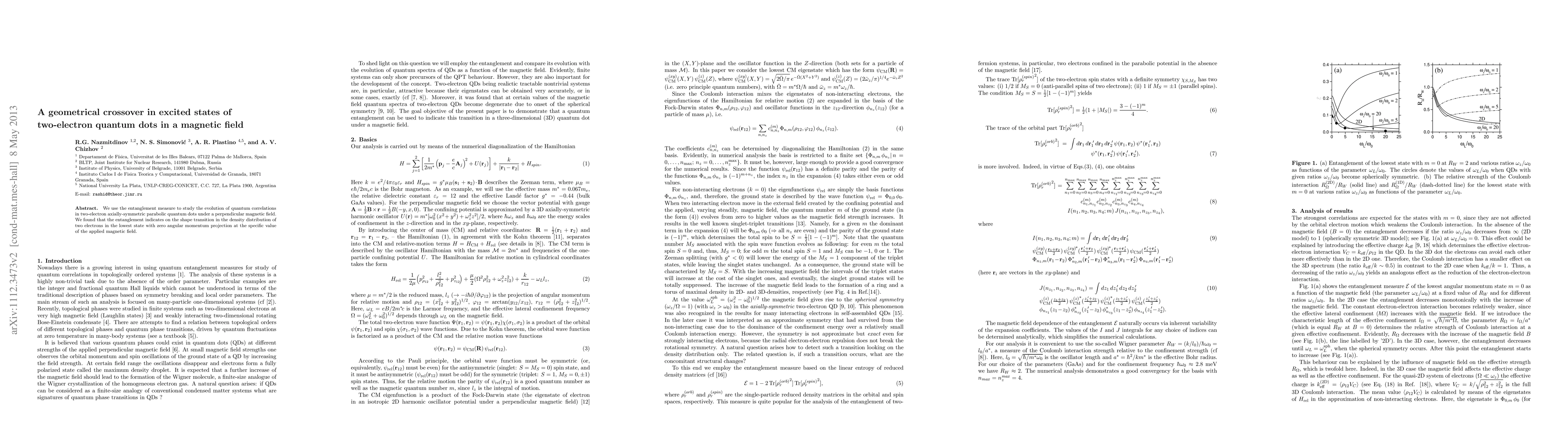Summary: This study investigates quantum correlations in two-electron quantum dots under a magnetic field, revealing that entanglement signals a shape transition in the electron density distribution at a specific magnetic field strength, indicating a geometrical crossover in excited states.