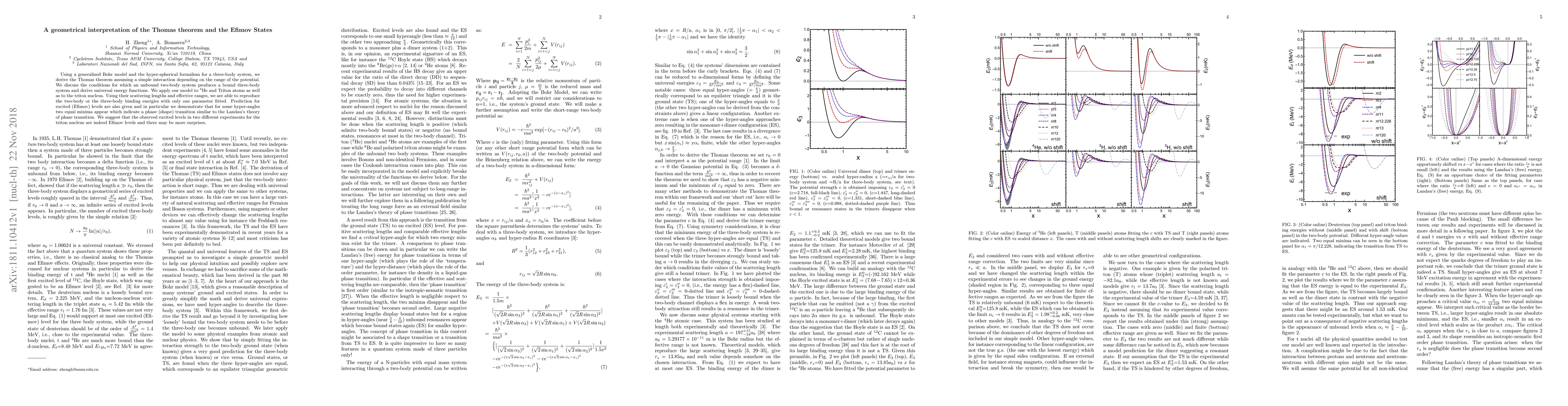 Using a generalized Bohr model and the hyper-spherical formalism for a three-body system, we derive the Thomas theorem assuming a simple interaction depending on the range of the potential. We discuss the conditions for which an unbound two-body system produces a bound three-body system and derive universal energy functions. We apply our model to $^{4}$He and Triton atoms as well as to the triton nucleus. Using their scattering lengths and effective ranges, we are able to reproduce the two-body or the three-body binding energies with only one parameter fitted. Prediction for excited (Efimov) levels are also given and in particular we demonstrate that for some hyper-angles two equal minima appear which indicate a phase (shape) transition similar to the Landau's theory of phase transition. We suggest that the observed excited levels in two different experiments for the triton nucleus are indeed Efimov levels and there may be more surprises.