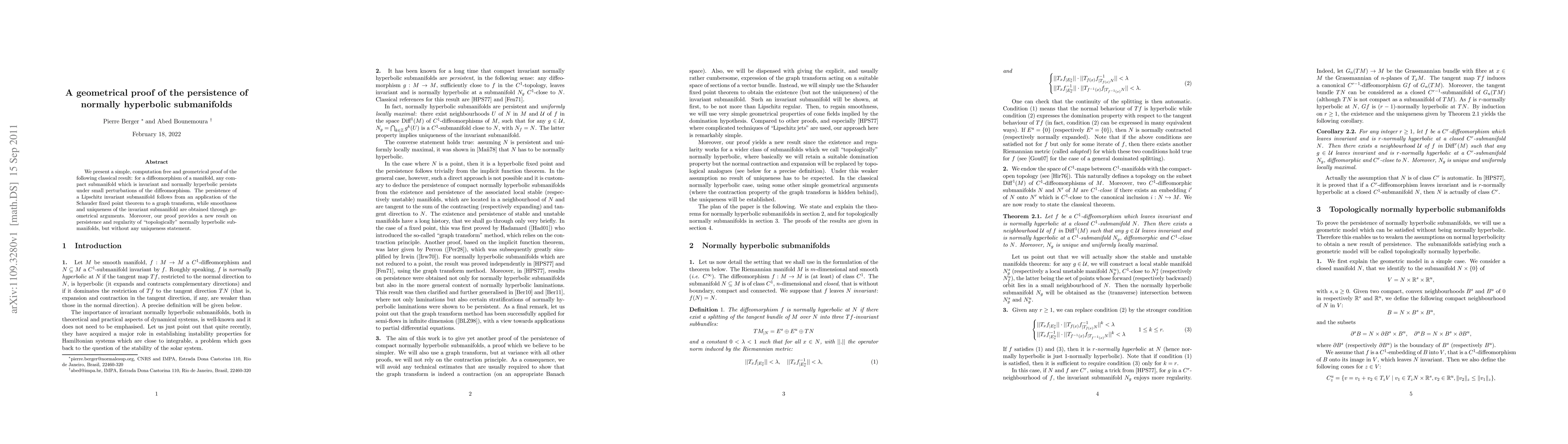 This paper offers a geometrical proof that compact submanifolds invariant and normally hyperbolic under a diffeomorphism persist under small perturbations. It leverages the Schauder fixed point theorem and geometrical arguments to ensure smoothness and uniqueness, while also proving the persistence of topologically normally hyperbolic submanifolds without asserting uniqueness.