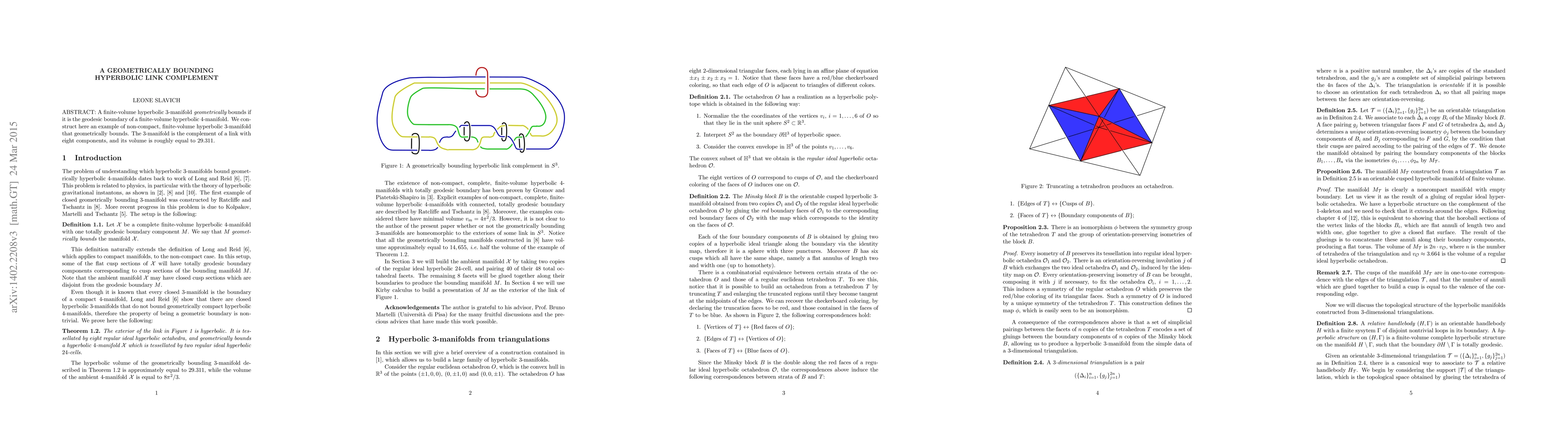 This paper constructs a non-compact, finite-volume hyperbolic 3-manifold that geometrically bounds a hyperbolic 4-manifold, specifically the complement of an eight-component hyperbolic link with a volume of approximately 29.311. The example provides insight into the geometric properties of hyperbolic link complements.