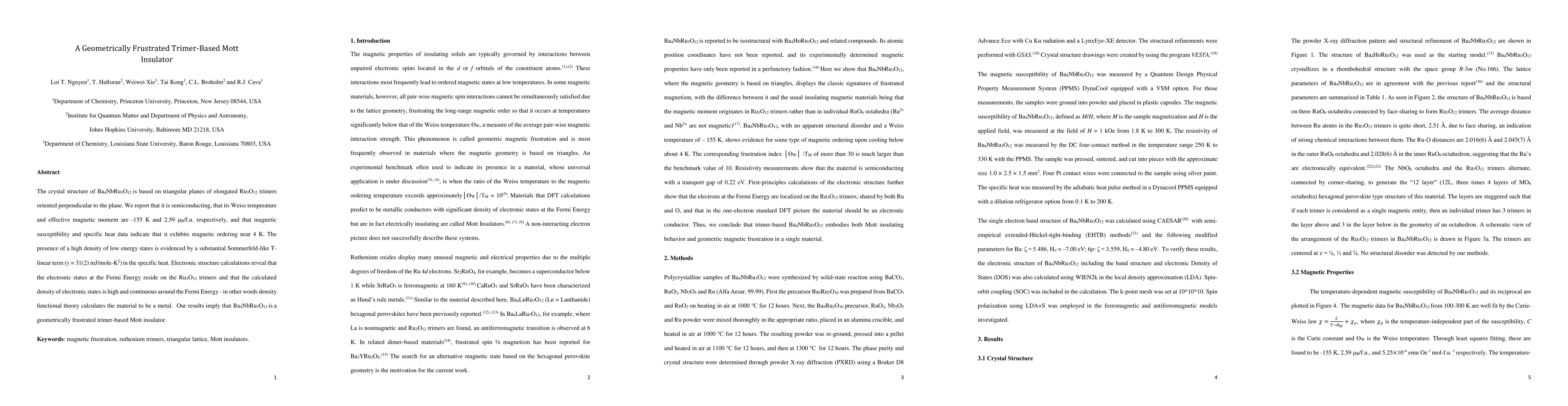 Ba4NbRu3O12 features triangular planes of Ru3O12 trimers, exhibiting semiconducting behavior and magnetic ordering near 4 K. Despite DFT calculations suggesting metallic behavior, the material's high density of low-energy states and T-linear term in specific heat indicate it functions as a geometrically frustrated trimer-based Mott insulator.