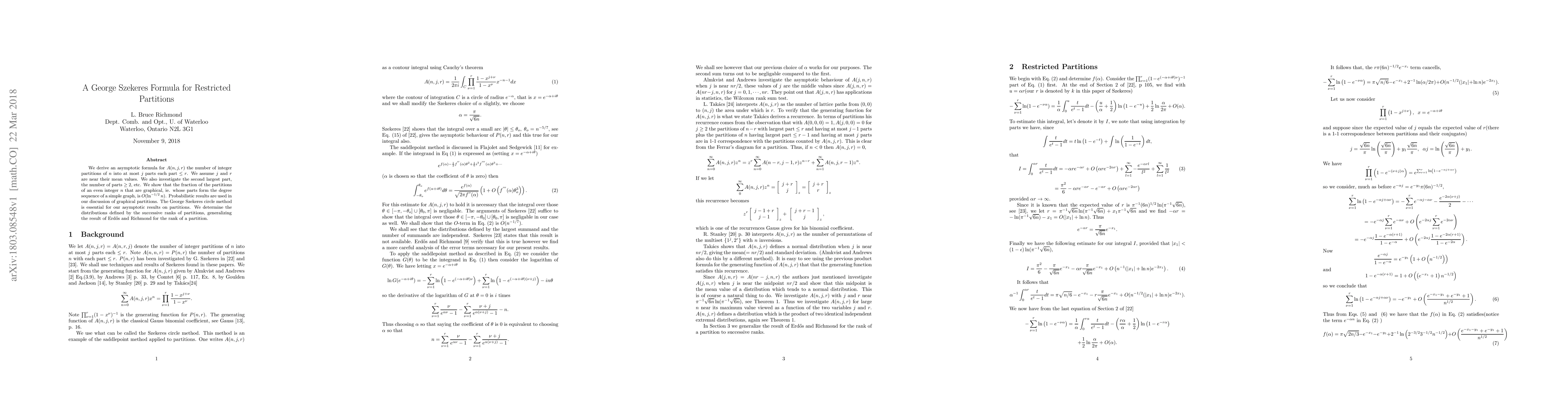 We derive an asymptotic formula for $A(n,j,r)$ the number of integer partitions of $n$ into at most $j$ parts each part $\le r$. We assume $j$ and $r$ are near their mean values. We also investigate the second largest part, the number of parts $\ge 2$, etc. We show that the fraction of the partitions of an even integer $n$ that are graphical, ie. whose parts form the degree sequence of a simple graph, is $O(\ln^{-1/2} n)$. Probabilistic results are used in our discussion of graphical partitions. The George Szekeres circle method is essential for our asymptotic results on partitions. We determine the distributions defined by the successive ranks of partitions, generalizing the result of Erdos and Richmond for the rank of a partition.