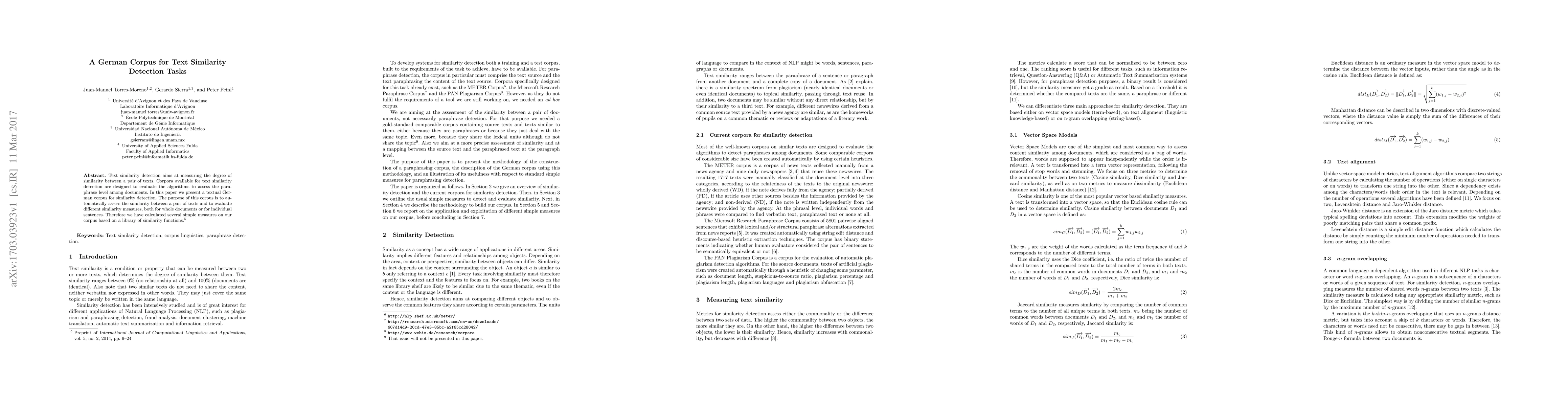 Text similarity detection aims at measuring the degree of similarity between a pair of texts. Corpora available for text similarity detection are designed to evaluate the algorithms to assess the paraphrase level among documents. In this paper we present a textual German corpus for similarity detection. The purpose of this corpus is to automatically assess the similarity between a pair of texts and to evaluate different similarity measures, both for whole documents or for individual sentences. Therefore we have calculated several simple measures on our corpus based on a library of similarity functions.