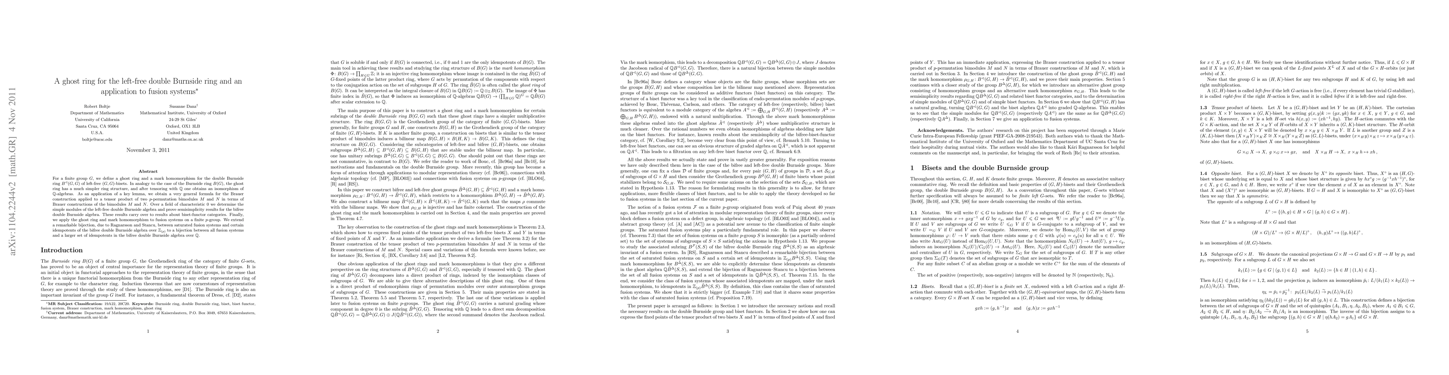 For a finite group $G$, we define a ghost ring and a mark homomorphism for the double Burnside ring of left-free $(G,G)$-bisets. In analogy to the case of the Burnside ring $B(G)$, the ghost ring has a much simpler ring structure, and after tensoring with $\QQ$ one obtains an isomorphism of $\QQ$-algebras. As an application of a key lemma, we obtain a very general formula for the Brauer construction applied to a tensor product of two $p$-permutation bimodules $M$ and $N$ in terms of Brauer constructions of the bimodules $M$ and $N$. Over a field of characteristic 0 we determine the simple modules of the left-free double Burnside algebra and prove semisimplicity results for the bifree double Burnside algebra. These results carry over to results about biset-functor categories. Finally, we apply the ghost ring and mark homomorphism to fusion systems on a finite $p$-group. We extend a remarkable bijection, due to Ragnarsson and Stancu, between saturated fusion systems and certain idempotents of the bifree double Burnside algebra over $\ZZ_{(p)}$, to a bijection between all fusion systems and a larger set of idempotents in the bifree double Burnside algebra over $\QQ.$
