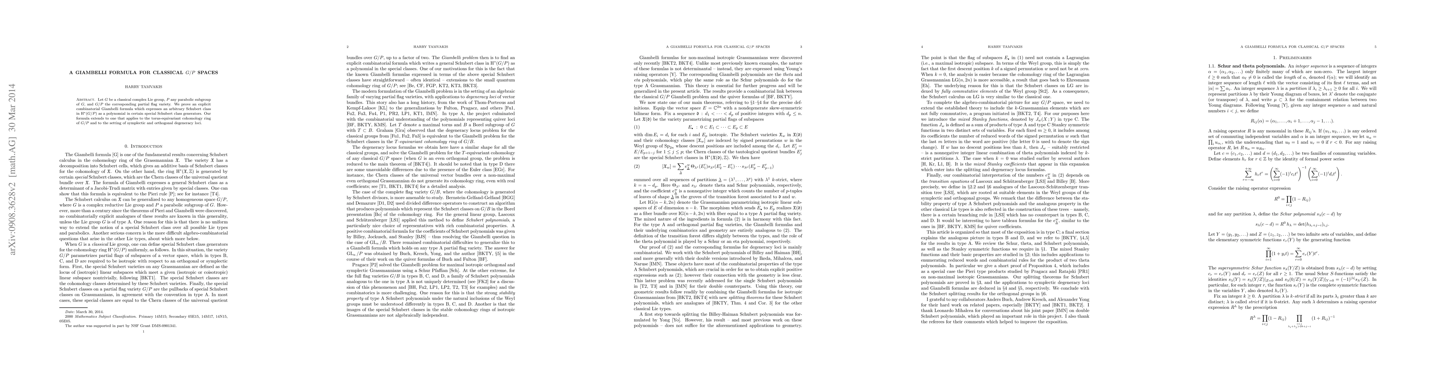 This paper proves an explicit combinatorial Giambelli formula for Schubert classes in the cohomology ring of classical $G/P$ spaces, extending it to torus-equivariant cohomology and applicable to symplectic and orthogonal degeneracy loci.