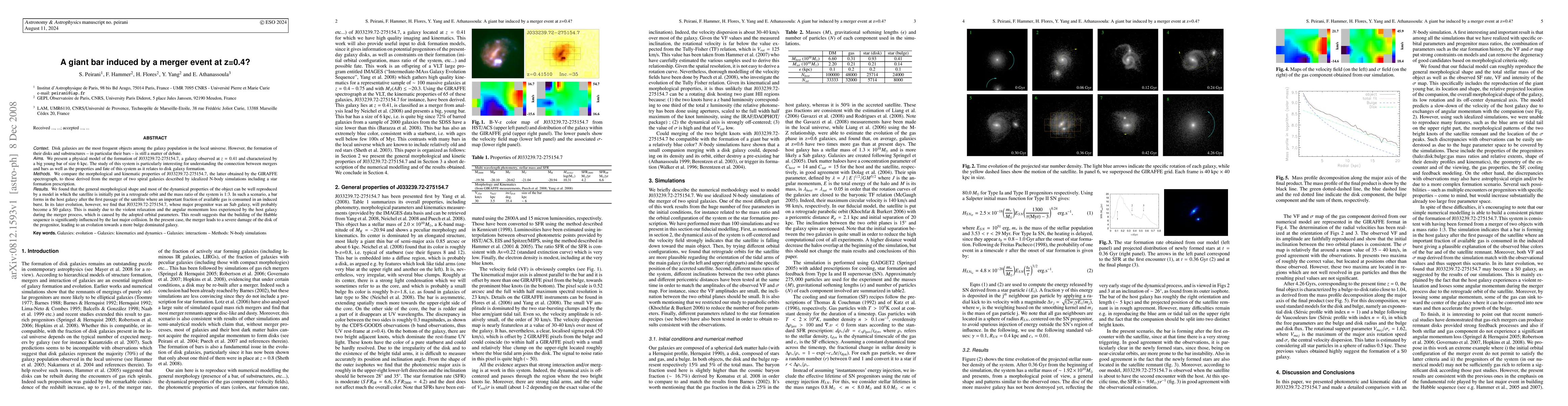 (Aims) We present a physical model of the formation of J033239.72-275154.7, a galaxy observed at z=0.41 and characterized by a big young bar of size 6 kpc. The study of this system is particularly interesting for understanding the connection between mergers and bars as well as the properties and fate of this system as it relates to disk galaxy formation. (Methods) We compare the morphological and kinematic properties of J033239.72-275154.7, the latter obtained by the GIRAFFE spectrograph, to those derived from the merger of two spiral galaxies described by idealized N-body simulations including a star formation prescription. (Results) We found that the general morphological shape and most of the dynamical properties of the object can be well reproduced by a model in which the satellite is initially put in a retrograde orbit and the mass ratio of the system is 1:3. In such a scenario, a bar forms in the host galaxy after the first passage of the satellite where an important fraction of available gas is consumed in an induced burst. In its later evolution, however, we find that J033239.72-275154.7, whose major progenitor was an Sab galaxy, will probably become a S0 galaxy. This is mainly due to the violent relaxation and the angular momentum loss experienced by the host galaxy during the merger process, which is caused by the adopted orbital parameters. This result suggests that the building of the Hubble sequence is significantly influenced by the last major collision. In the present case, the merger leads to a severe damage of the disk of the progenitor, leading to an evolution towards a more bulge dominated galaxy.