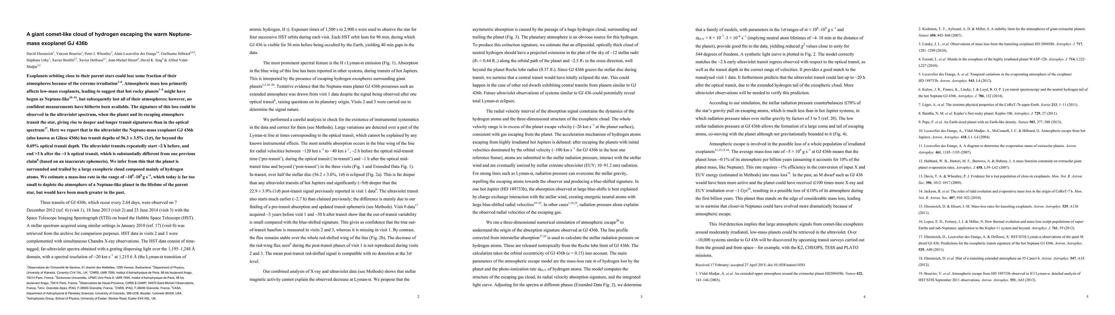 This paper reports the detection of a giant hydrogen cloud escaping the atmosphere of the Neptune-mass exoplanet GJ 436b, evidenced by significantly deeper and longer ultraviolet transits compared to optical transits. The findings suggest a historical higher mass-loss rate, indicating the planet may have originally been Neptune-like but lost its atmosphere over time due to stellar irradiation.