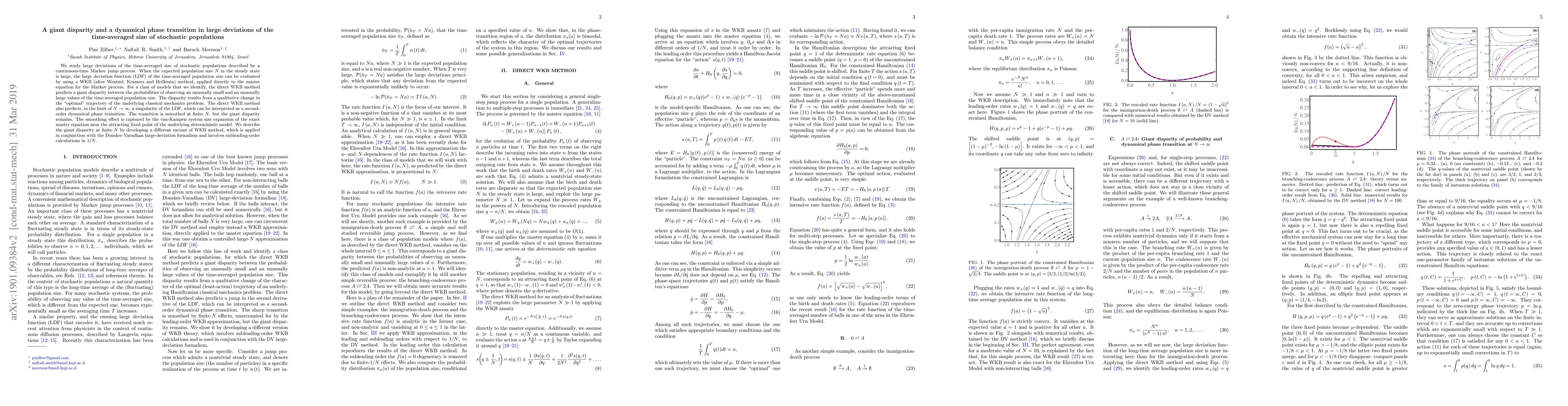 We study large deviations of the time-averaged size of stochastic populations described by a continuous-time Markov jump process. When the expected population size $N$ in the steady state is large, the large deviation function (LDF) of the time-averaged population size can be evaluated by using a WKB (after Wentzel, Kramers and Brillouin) method, applied directly to the master equation for the Markov process. For a class of models that we identify, the direct WKB method predicts a giant disparity between the probabilities of observing an unusually small and an unusually large values of the time-averaged population size. The disparity results from a qualitative change in the "optimal" trajectory of the underlying classical mechanics problem. The direct WKB method also predicts, in the limit of $N\to \infty$, a singularity of the LDF, which can be interpreted as a second-order dynamical phase transition. The transition is smoothed at finite $N$, but the giant disparity remains. The smoothing effect is captured by the van-Kampen system size expansion of the exact master equation near the attracting fixed point of the underlying deterministic model. We describe the giant disparity at finite $N$ by developing a different variant of WKB method, which is applied in conjunction with the Donsker-Varadhan large-deviation formalism and involves subleading-order calculations in $1/N$.