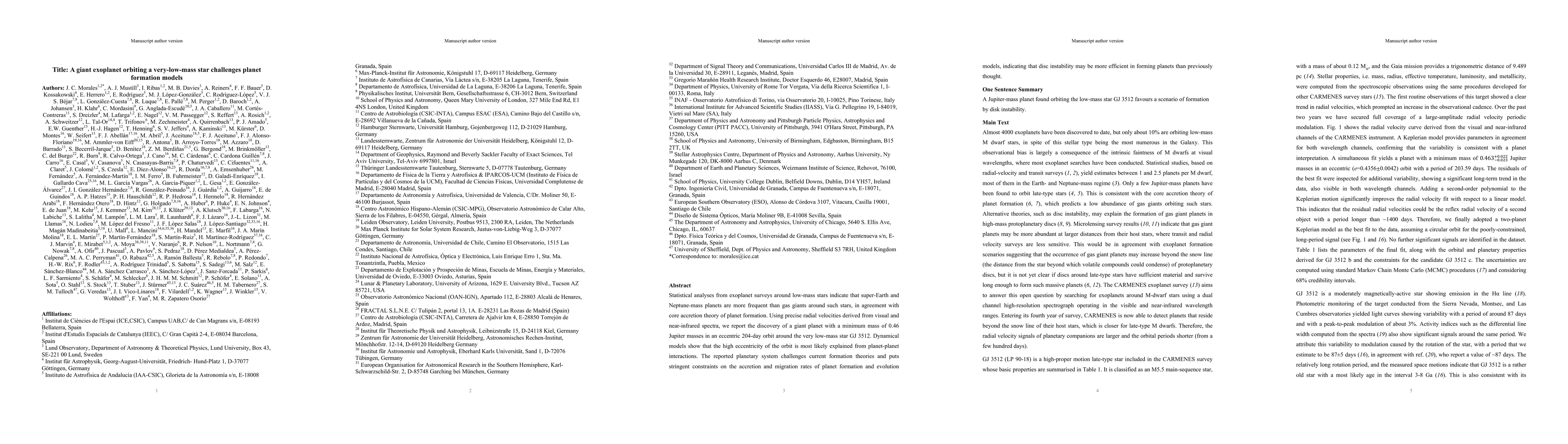 This paper reports the discovery of a giant exoplanet orbiting a very low-mass star, challenging current core accretion models which predict fewer gas giants around such stars. The findings suggest that disc instability may play a more significant role in planet formation than previously considered.