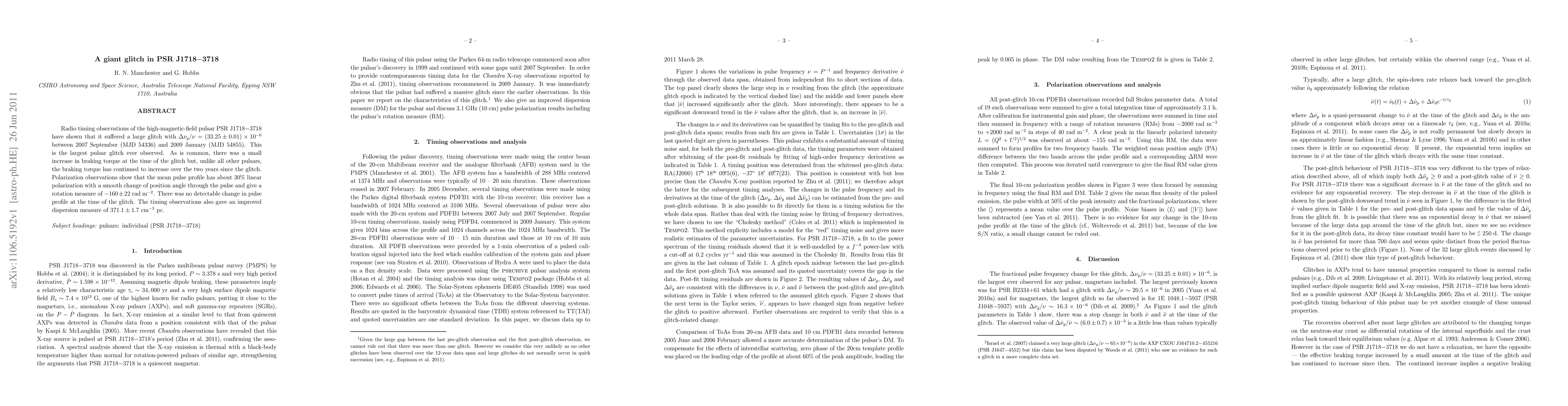 Radio timing observations of the high-magnetic-field pulsar PSR J1718-3718 have shown that it suffered a large glitch with Dnu_g/nu = (33.25 +/- 0.01) x 10^{-6} between 2007 September (MJD 54336) and 2009 January (MJD 54855). This is the largest pulsar glitch ever observed. As is common, there was a small increase in braking torque at the time of the glitch but, unlike all other pulsars, the braking torque has continued to increase over the two years since the glitch. Polarization observations show that the mean pulse profile has about 30% linear polarization with a smooth change of position angle through the pulse and give a rotation measure of -160 +/- 22 rad m^{-2}. There was no detectable change in pulse profile at the time of the glitch. The timing observations also gave an improved dispersion measure of 371.1 +/- 1.7 cm^{-3}pc.