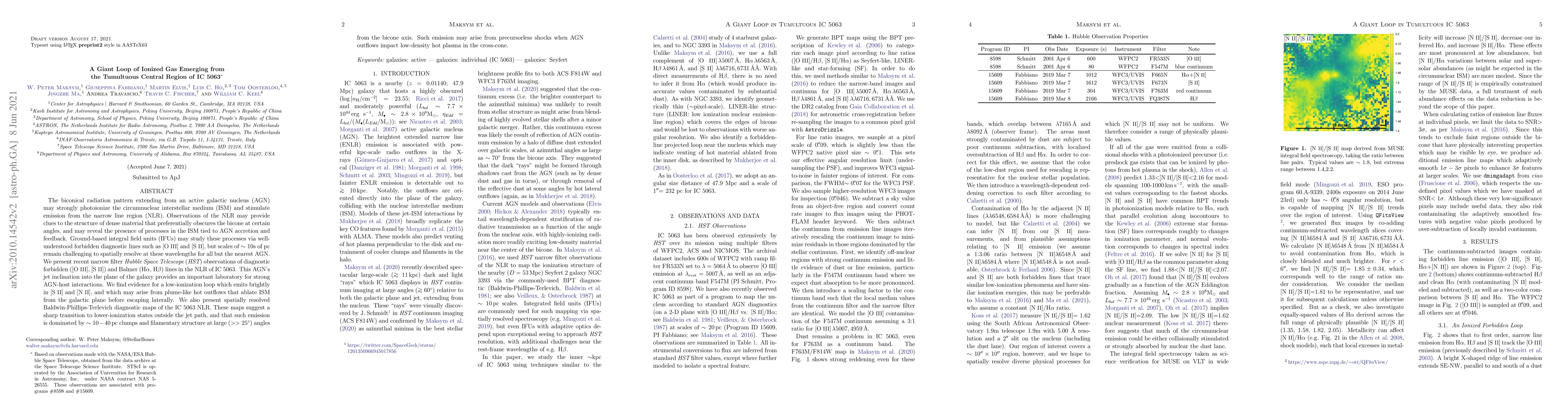 The biconical radiation pattern extending from an active galactic nucleus (AGN) may strongly photoionize the circumnuclear interstellar medium (ISM) and stimulate emission from the narrow line region (NLR). Observations of the NLR may provide clues to the structure of dense material that preferentially obscures the bicone at certain angles, and may reveal the presence of processes in the ISM tied to AGN accretion and feedback. Ground-based integral field units (IFUs) may study these processes via well-understood forbidden diagnostic lines such as [O III] and [S II], but scales of $\sim10$s of pc remain challenging to spatially resolve at these wavelengths for all but the nearest AGN. We present recent narrow filter Hubble Space Telescope (HST) observations of diagnostic forbidden ([O III], [S II]) and Balmer (H$\alpha$, H$\beta$) lines in the NLR of IC 5063. This AGN's jet inclination into the plane of the galaxy provides an important laboratory for strong AGN-host interactions. We find evidence for a low-ionization loop which emits brightly in [S II] and [N II], and which may arise from plume-like hot outflows that ablate ISM from the galactic plane before escaping laterally. We also present spatially resolved Baldwin-Phillips-Terlevich diagnostic maps of the IC 5063 NLR. These maps suggest a sharp transition to lower-ionization states outside the jet path, and that such emission is dominated by $\sim10-40$ pc clumps and filamentary structure at large (>>25{\deg}) angles from the bicone axis. Such emission may arise from precursorless shocks when AGN outflows impact low-density hot plasma in the cross-cone.