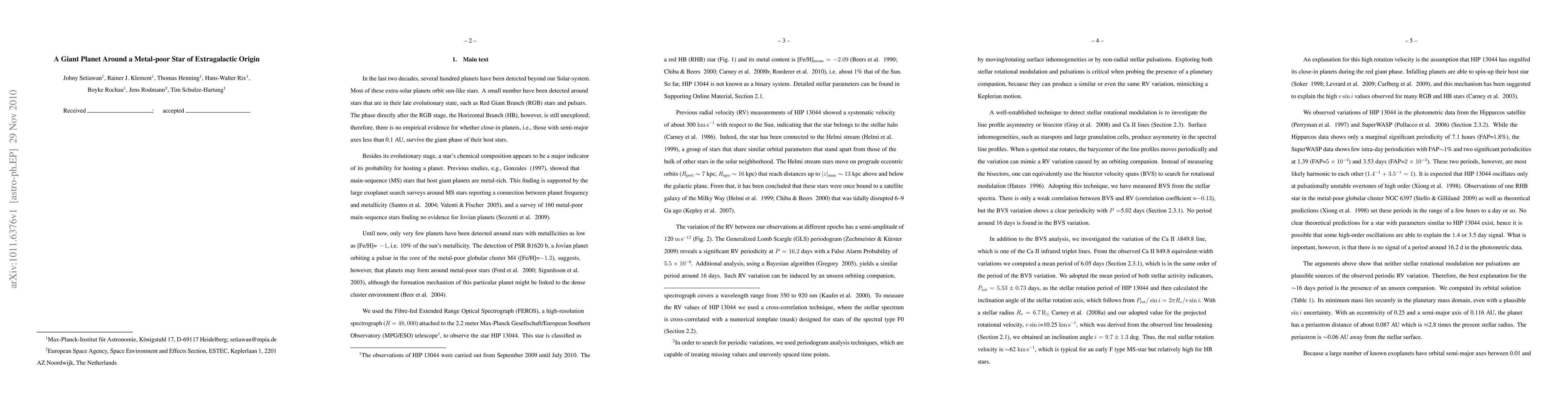 This paper reports the discovery of a giant planet with a minimum mass of 1.25 Jupiter masses orbiting HIP 13044, a metal-poor red Horizontal Branch star. The planet's extragalactic origin is suggested as HIP 13044 is believed to have been accreted from a disrupted satellite galaxy of the Milky Way.