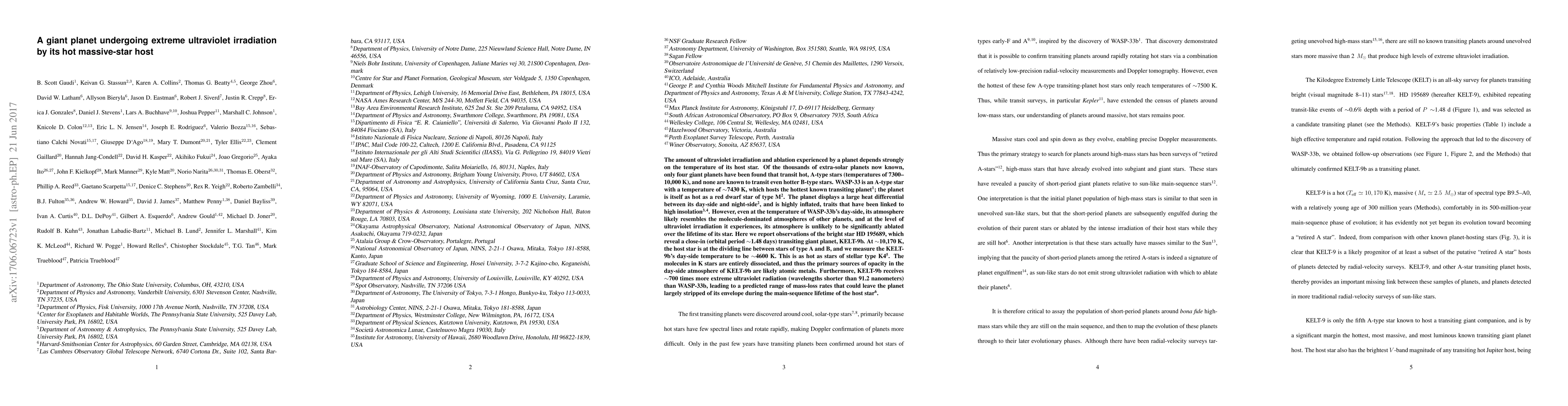 This paper reports observations of KELT-9b, a transiting giant planet orbiting the extremely hot star HD 195689, which receives 700 times more extreme ultraviolet radiation than WASP-33b. The planet's day-side temperature is as hot as K4 stars, and its atmosphere may be largely stripped away due to intense ultraviolet irradiation.