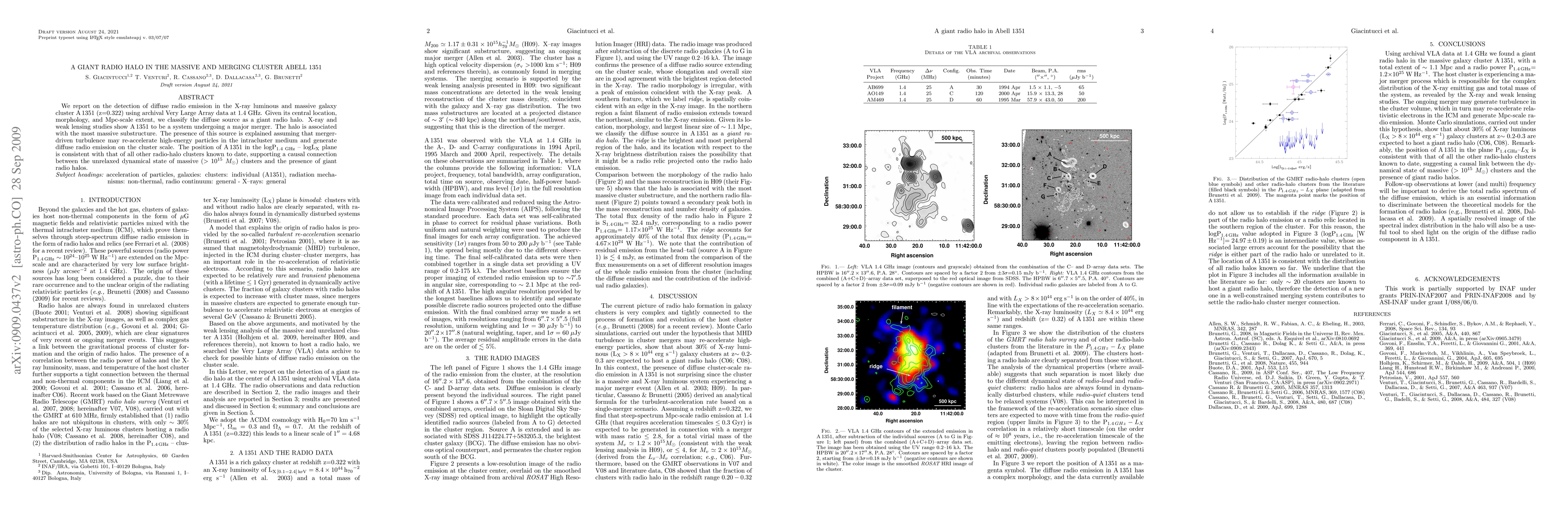We report on the detection of diffuse radio emission in the X-ray luminous and massive galaxy cluster A1351 (z=0.322) using archival Very Large Array data at 1.4 GHz. Given its central location, morphology, and Mpc-scale extent, we classify the diffuse source as a giant radio halo. X-ray and weak lensing studies show A1351 to be a system undergoing a major merger. The halo is associated with the most massive substructure. The presence of this source is explained assuming that merger-driven turbulence may re-accelerate high-energy particles in the intracluster medium and generate diffuse radio emission on the cluster scale. The position of A1351 in the logP$_{1.4 GHz}$ - logL$_{X}$ plane is consistent with that of all other radio-halo clusters known to date, supporting a causal connection between the unrelaxed dynamical state of massive ($>10^{15} M_{\odot}$) clusters and the presence of giant radio halos.