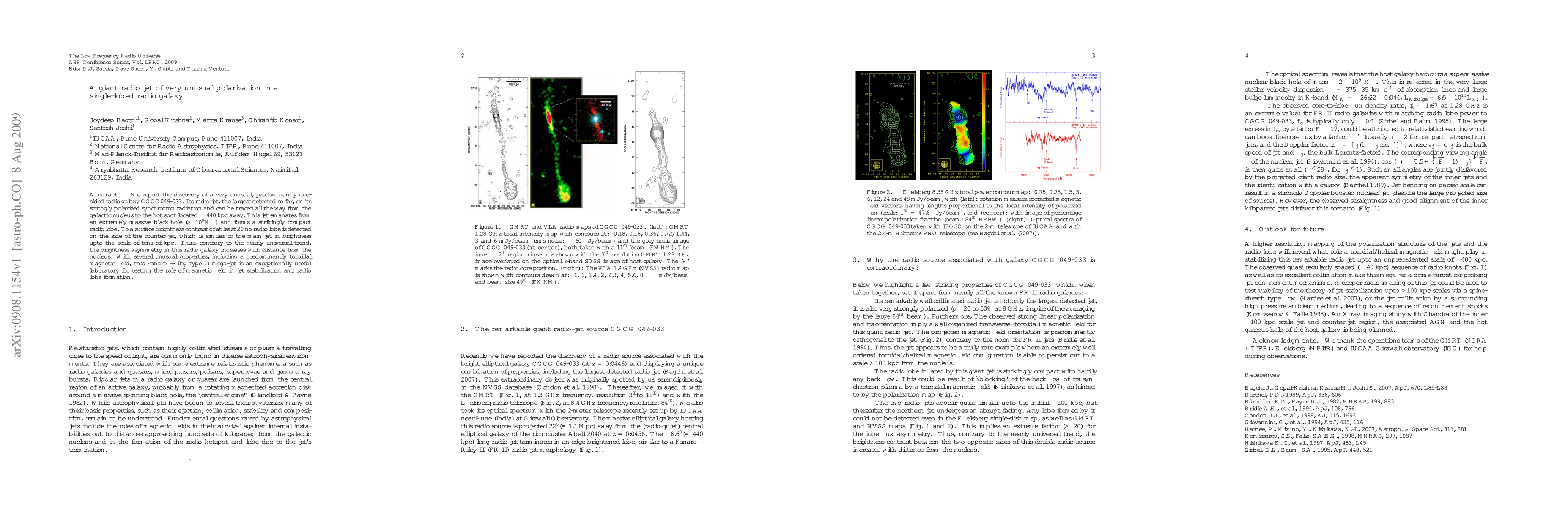 We report the discovery of a very unusual, predominantly one-sided radio galaxy CGCG049-033. Its radio jet, the largest detected so far, emits strongly polarized synchrotron radiation and can be traced all the way from the galactic nucleus to the hot spot located ~440 kpc away. This jet emanates from an extremely massive black-hole (mass > 10^9 times solar mass) and forms a strikingly compact radio lobe. To a surface brightness contrast of at least 20 no radio lobe is detected on the side of the counter-jet, which is similar to the main jet in brightness upto the scale of tens of kpc. Thus, contrary to the nearly universal trend, the brightness asymmetry in this radio galaxy increases with distance from the nucleus. With several unusual properties, including a predominantly toroidal magnetic field, this Fanaroff-Riley type II (FR-II) mega-jet is an exceptionally useful laboratory for testing the role of magnetic field in jet stabilization and radio lobe formation.