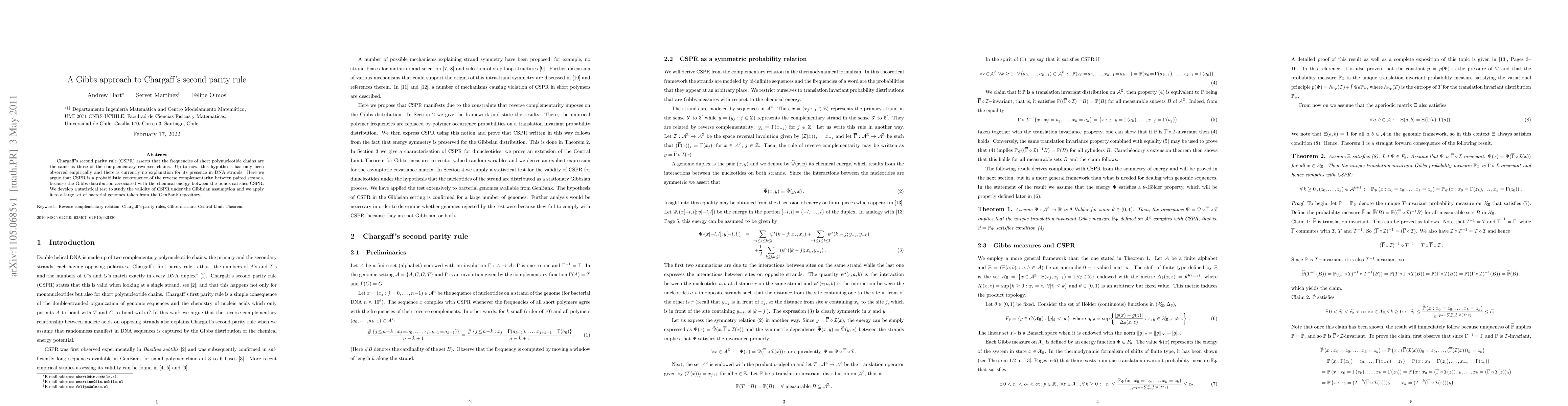 This paper proposes that Chargaff's second parity rule (CSPR) arises probabilistically from the reverse complementarity of DNA strands, supported by the Gibbs distribution of chemical energy between bonds. The authors develop a statistical test to validate CSPR and apply it to bacterial genomes, finding support for the rule.