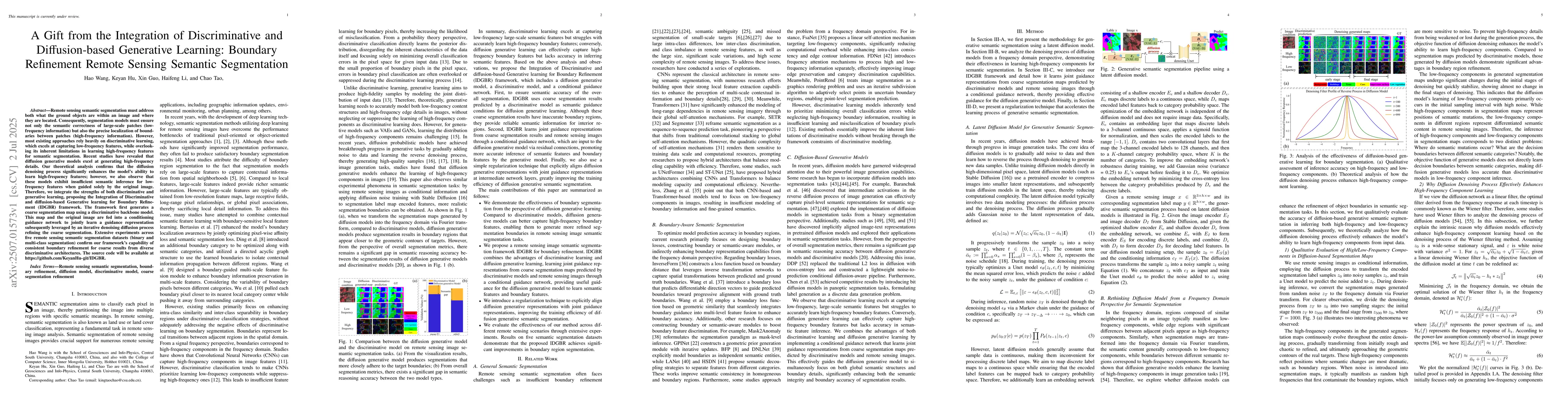 Remote sensing semantic segmentation must address both what the ground objects are within an image and where they are located. Consequently, segmentation models must ensure not only the semantic correctness of large-scale patches (low-frequency information) but also the precise localization of boundaries between patches (high-frequency information). However, most existing approaches rely heavily on discriminative learning, which excels at capturing low-frequency features, while overlooking its inherent limitations in learning high-frequency features for semantic segmentation. Recent studies have revealed that diffusion generative models excel at generating high-frequency details. Our theoretical analysis confirms that the diffusion denoising process significantly enhances the model's ability to learn high-frequency features; however, we also observe that these models exhibit insufficient semantic inference for low-frequency features when guided solely by the original image. Therefore, we integrate the strengths of both discriminative and generative learning, proposing the Integration of Discriminative and diffusion-based Generative learning for Boundary Refinement (IDGBR) framework. The framework first generates a coarse segmentation map using a discriminative backbone model. This map and the original image are fed into a conditioning guidance network to jointly learn a guidance representation subsequently leveraged by an iterative denoising diffusion process refining the coarse segmentation. Extensive experiments across five remote sensing semantic segmentation datasets (binary and multi-class segmentation) confirm our framework's capability of consistent boundary refinement for coarse results from diverse discriminative architectures. The source code will be available at https://github.com/KeyanHu-git/IDGBR.