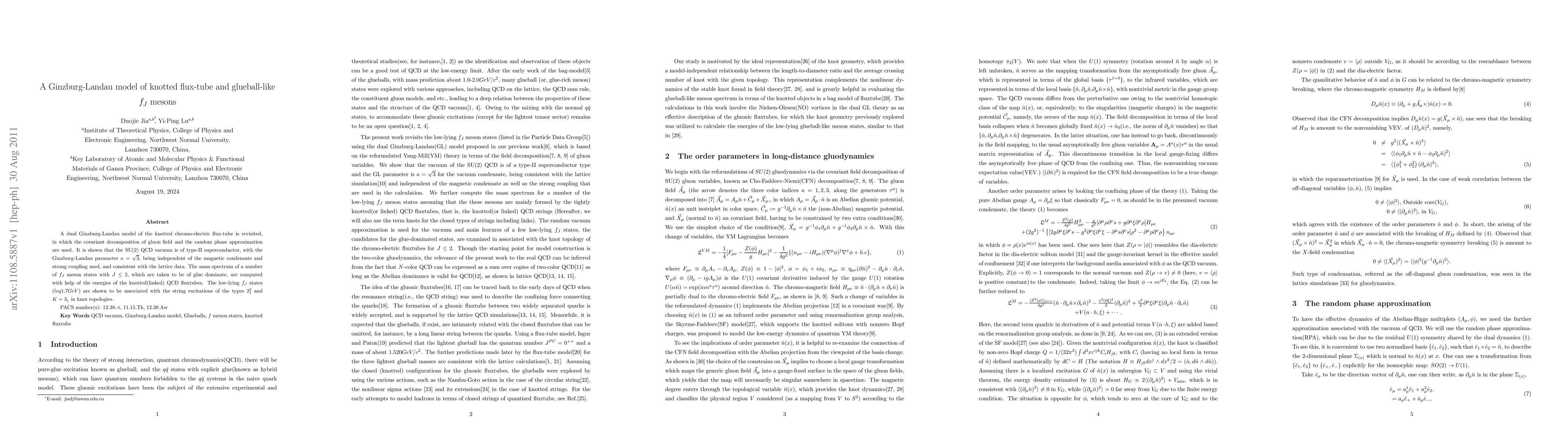 A dual Ginzburg-Landau model of the knotted chromo-electric flux-tube is revisited, in which the covariant decomposition of gluon field and the random phase approximation are used. It is shown that the SU(2) QCD vacuum is of type-II superconductor, with the Ginzburg-Landau parameter $\kappa = \sqrt{3}$, being independent of the magnetic condensate and strong coupling used, and consistent with the lattice data. The mass spectrum of a number of $f_{J}$ meson states with $J\leq 2$, which are taken to be of glue dominate, are computed with help of the energies of the knotted(linked) QCD fluxtubes. The low-lying $f_{J}$ states ($leq 1.7GeV$) are shown to be associated with the string excitations of the types $2_{1}^{2}$ and $K=3_{1}^{{}}$ in knot topologies.