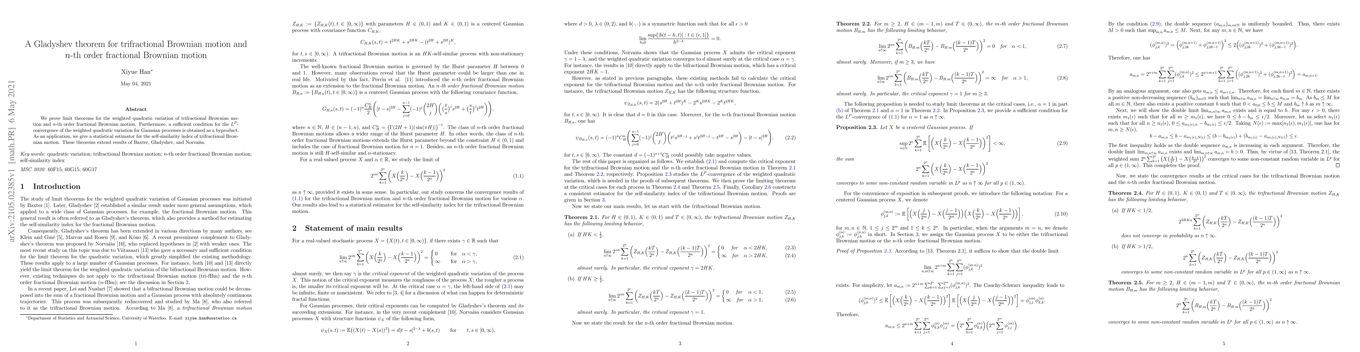 This paper proves limit theorems for the weighted quadratic variation of trifractional and $n$-th order fractional Brownian motion, extending Gladyshev's theorem. It also provides a statistical estimator for the self-similarity index of trifractional Brownian motion.